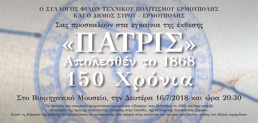 Ο Σύλλογος Φίλων Τεχνικού Πολιτισμού Ερμούπολης και ο Δήμος Σύρου – Ερμούπολης σας προσκαλούν στα εγκαίνια της έκθεσης «ΠΑΤΡΙΣ» Απολεσθέν το 1868 150 ...