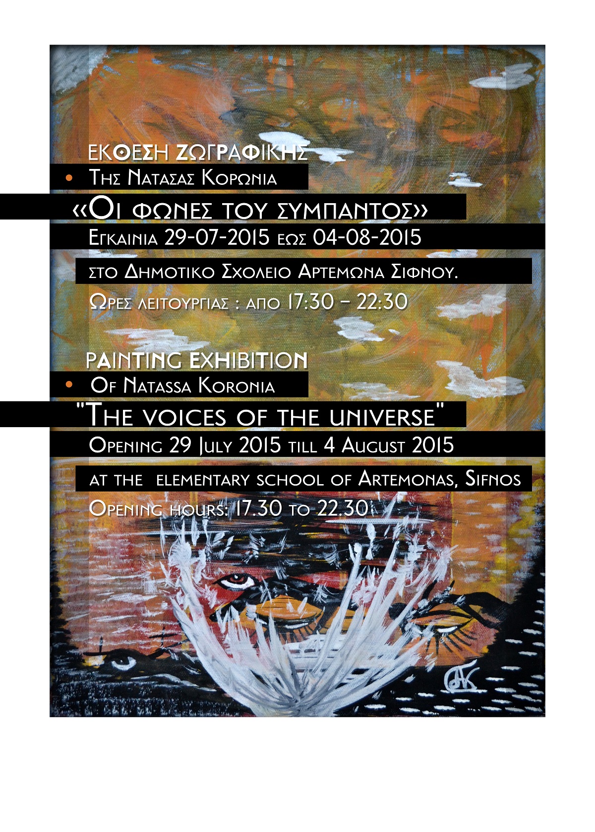 Στο πλαίσιο των πολιτιστικών εκδηλώσεων Σίφνου 2015 εγκαινιάζεται την Πέμπτη 29 Ιουλίου, στις 20.00, η έκθεση ζωγραφικής «Οι φωνές του Σύμπαντος» της...