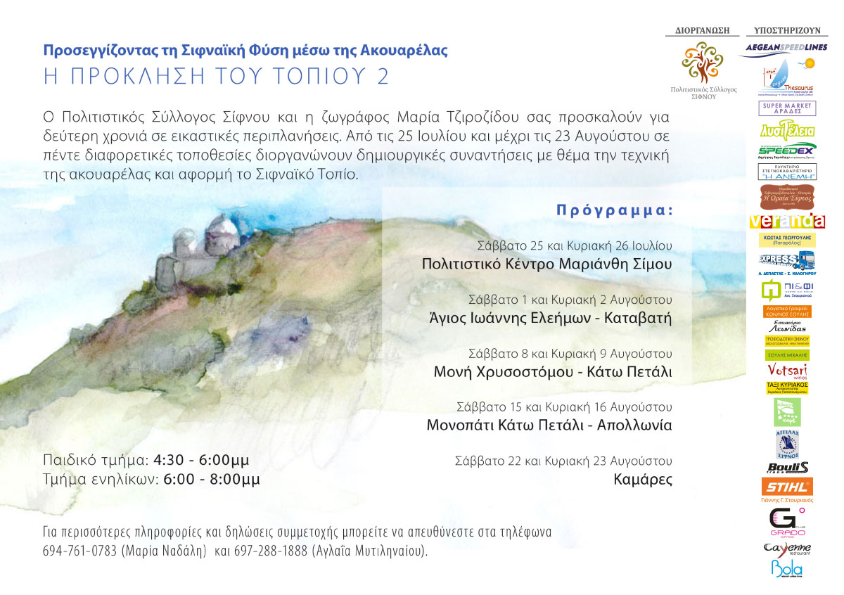 Ο Πολιτιστικός Σύλλογος Σίφνου και η ζωγράφος Μαρία Τζιροζίδου σας προσκαλούν για δεύτερη χρονιά σε εικαστικές περιπλανήσεις, με στόχο την προσέγγιση ...