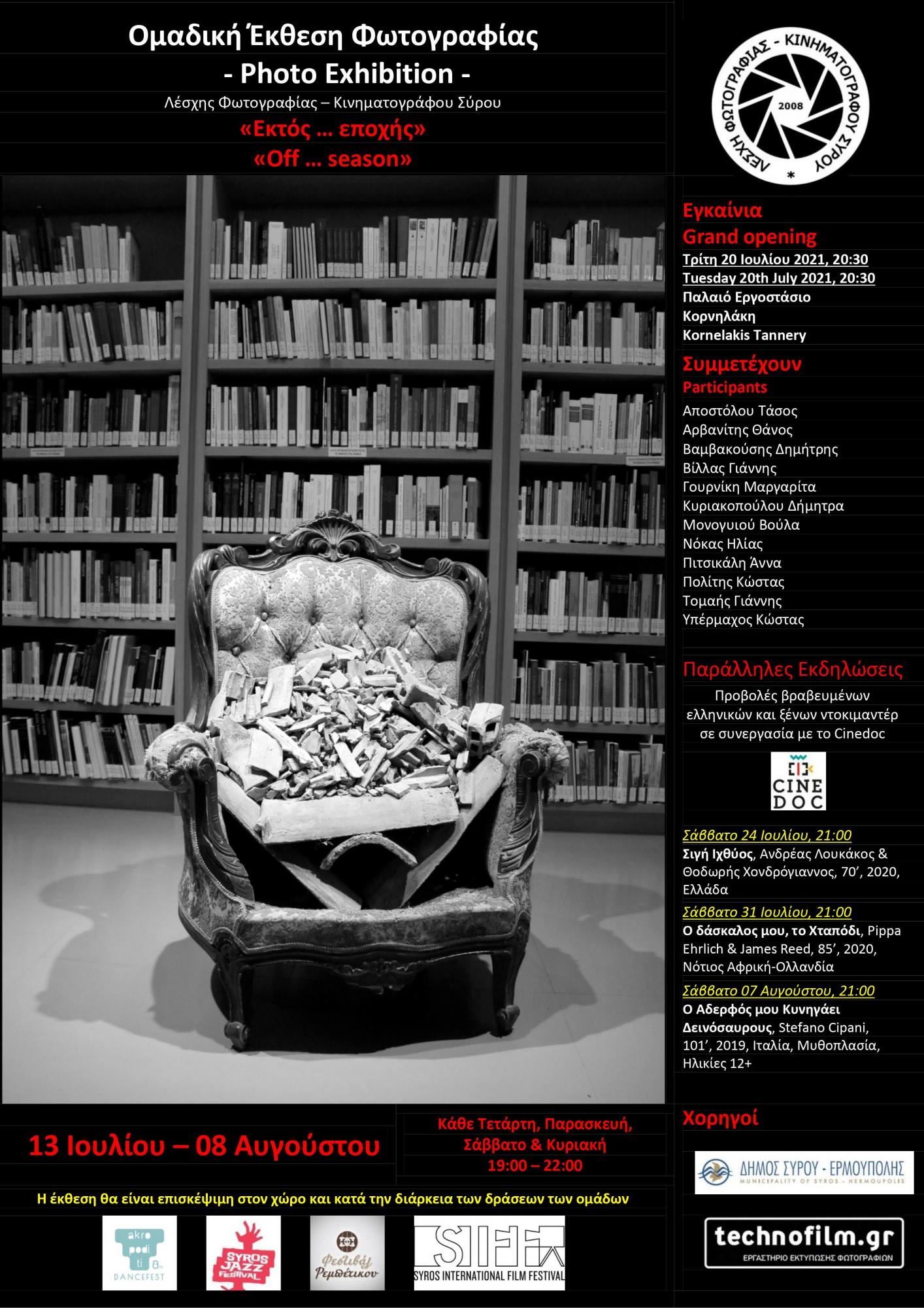 Εμπνευσμένος από τη θεματική του Syros International Film Festival “Off Season” είναι ο τίτλος της νέας ομαδικής έκθεσης της Λέσχης Φωτογραφίας – Κινη...