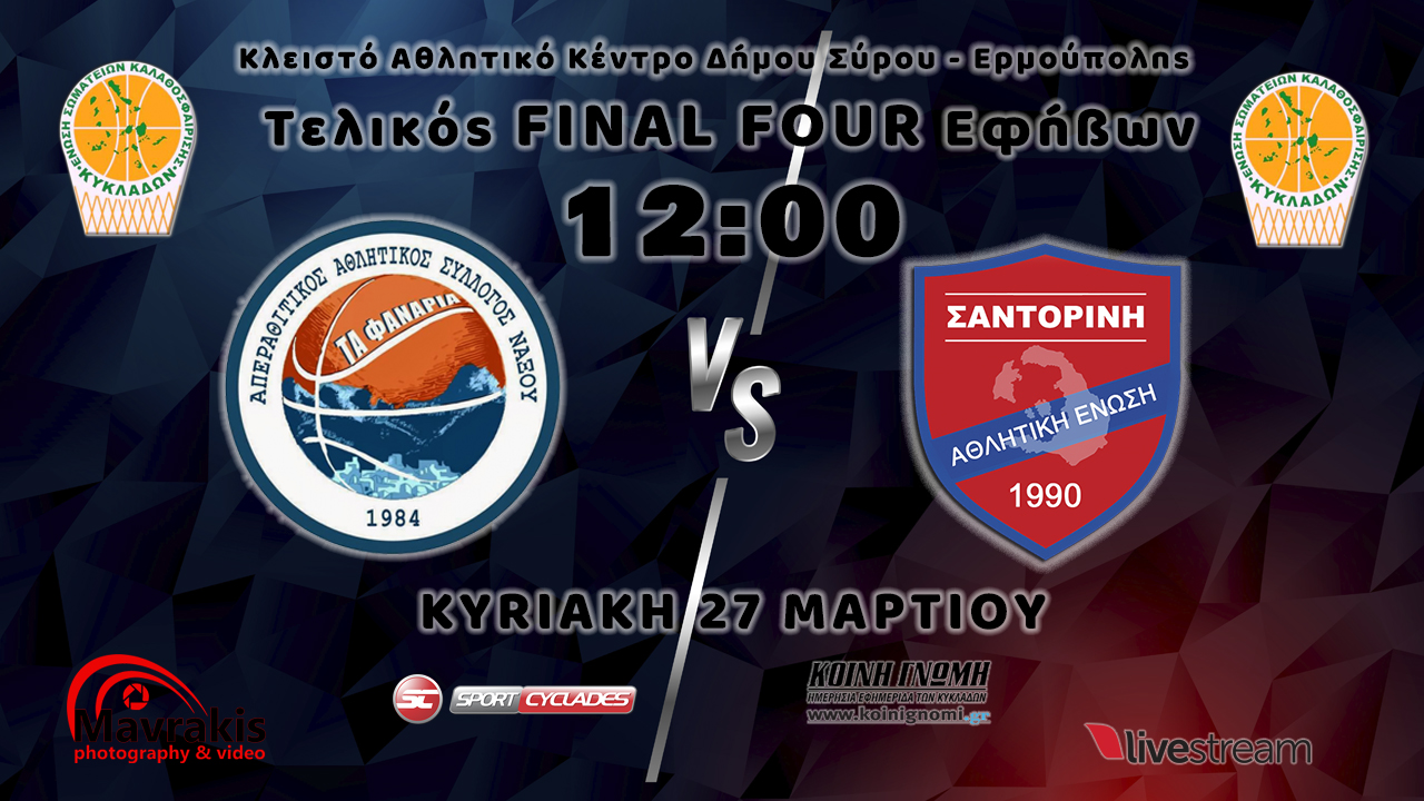 Παρακολουθήστε σε ζωντανή μετάδοση από το κλειστό γυμναστήριο της Σύρου τον Τελικό του Final-4 Εφήβων της ΕΣΚ Κυκλάδων μεταξύ του ΑΠΑΣ Νάξου ''Τα Φανά...