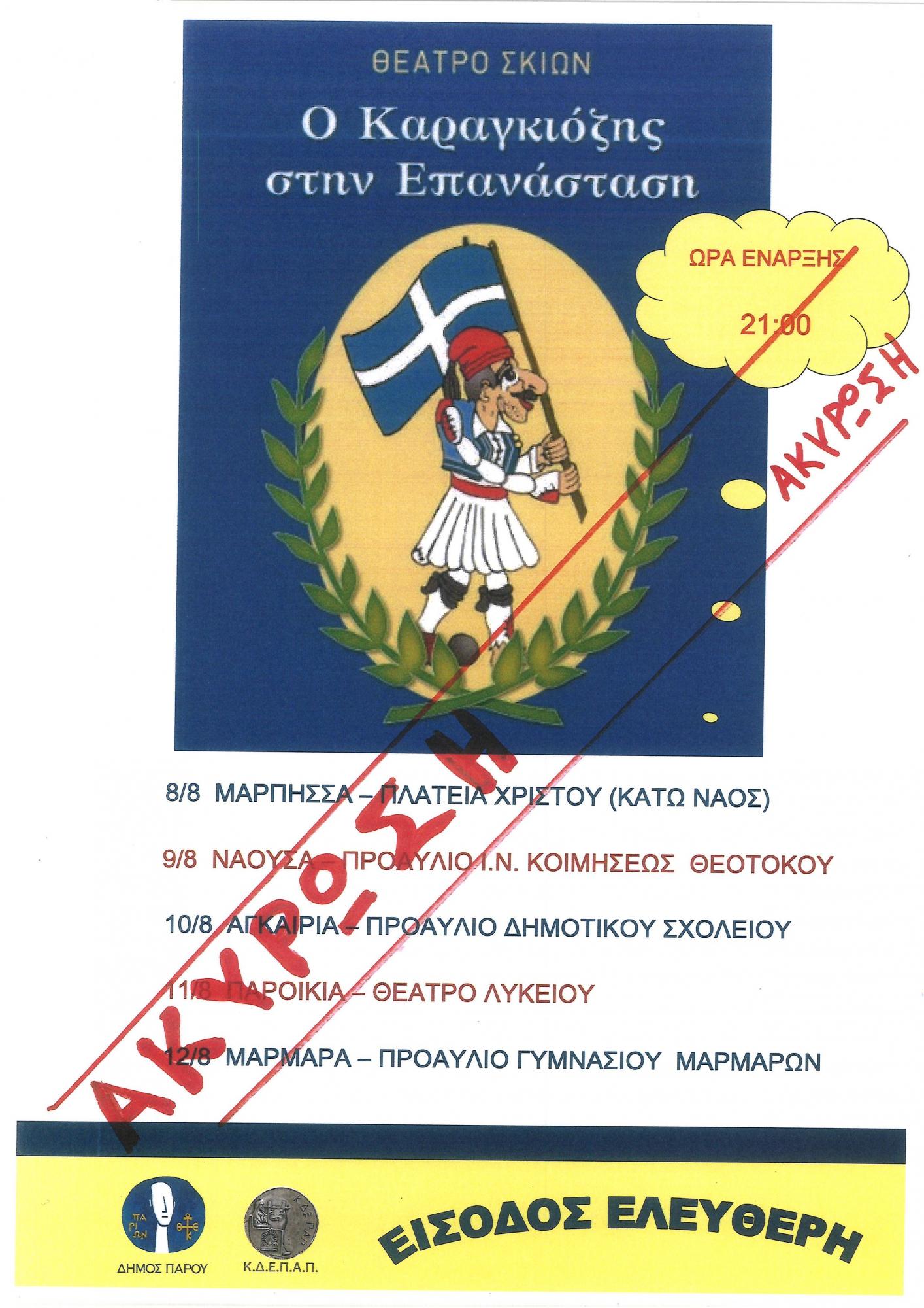 Οι προγραμματισμένες παραστάσεις θεάτρου σκιών στην Πάρο με θέμα «Ο Καραγκιόζης στην Επανάσταση» ακυρώνονται λόγω ύπαρξης επιβεβαιωμένου κρούσματος co...