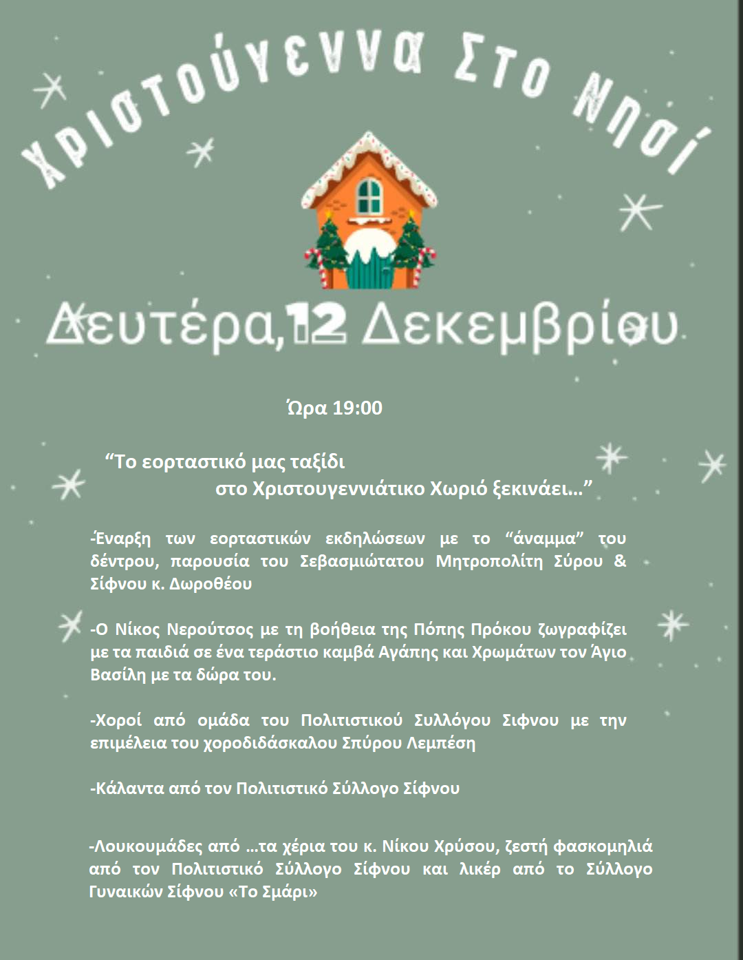 “Το εορταστικό μας ταξίδι στο Χριστουγεννιάτικο Χωριό ξεκινάει…” τη Δευτέρα 12 Δεκεμβρίου, ανήμερα της εορτής του Αγίου Σπυρίδωνα, στις 19:00, στο Αθλ...