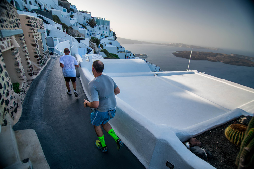 Επιπλέον με την κολύμβηση, για τους λάτρεις του τρεξίματος την Κυριακή 8 Οκτωβρίου το πρόγραμμα περιλαμβάνει 3 διαφορετικές διαδρομές, που έχουν ως «φόντο» τις μοναδικές εικόνες του ηφαιστείου με θέα από την Καλντέρα καθώς και τους οικισμούς Ημεροβίγλι, Φηροστεφάνι και Οία που κλέβουν την παράσταση. Πιο συγκεκριμένα η διαδρομή των 5 χλμ. είναι για τρέξιμο και δυναμικό περπάτημα, των 10 χλμ. για πιο εξοικειωμένους στις αποστάσεις και των 15 χλμ. για αυτούς που αγαπούν τη δύναμη, την τεχνική και την αντοχή. Όλες οι διαδρομές έχουν ως αφετηρία το εργοστάσιο αφαλάτωσης στην Οία, με σημεία χωμάτινης διαδρομής και τερματισμό πάλι στην Οία.