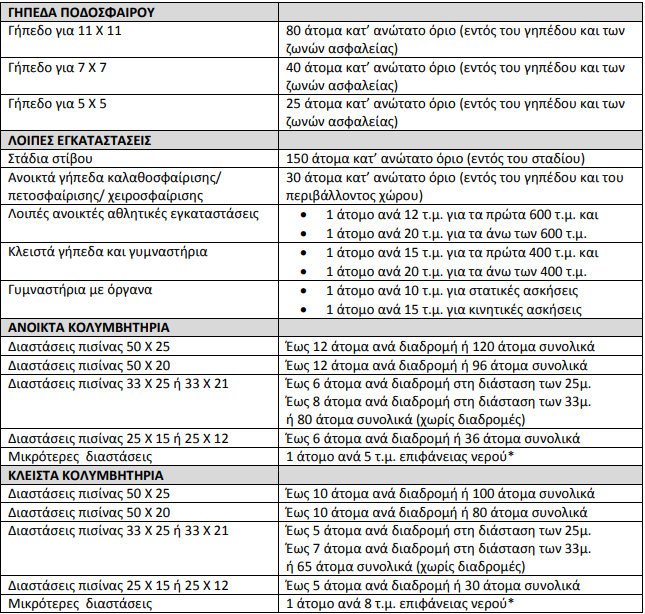 - Μειώνεται στο 75% ο μέγιστος αριθμός αθλουμένων ανά εγκατάσταση, σύμφωνα με τους Όρους Λειτουργίας Αθλητικών, Ναυταθλητικών Εγκαταστάσεων και Κολυμβητηρίων και τον σχετικό πίνακα με τον μέγιστο αριθμό αθλουμένων ανά εγκατάσταση (φωτό).