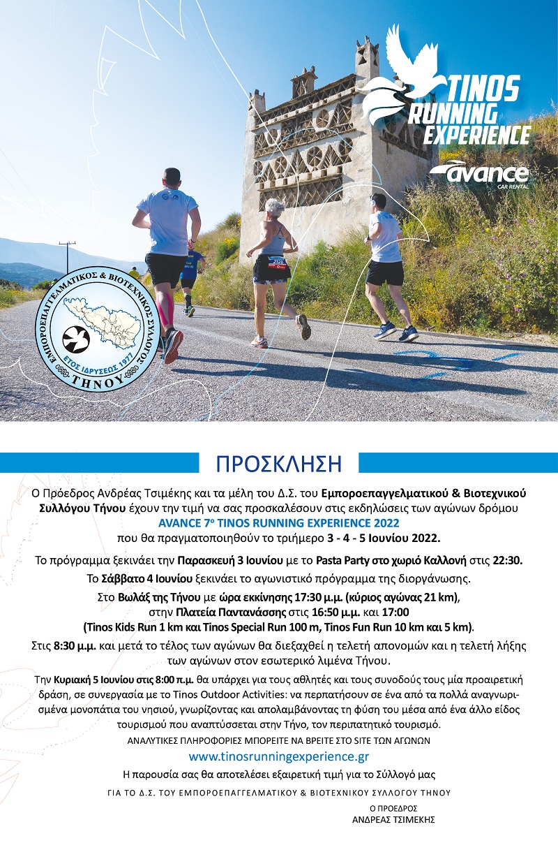 Σας ενημερώνουμε ότι, στα πλαίσια της διοργάνωσης AVANCE 7th TINOS RUNNING EXPERIENCE 2022 που θα γίνουν στις 04/06/2022 στην Τήνο, η γραμματεία των αγώνων θα λειτουργήσει στην Πλατεία Παντανάσσης :