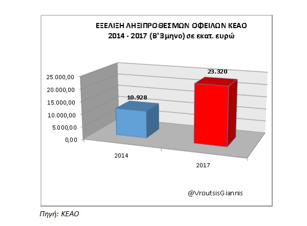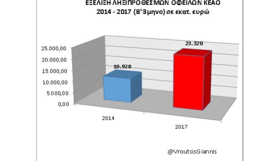 Συγκρίνοντας την εικόνα των ληξιπροθέσμων στο ΚΕΑΟ το 2014, με την αντίστοιχη σημερινή, η συνολική αύξηση των ληξιπροθέσμων μέσα σε 2,5 χρόνια με Κυβέρνηση ΣΥΡΙΖΑ - ΑΝΕΛ, εκτινάχθηκε κατά 113 %!!!