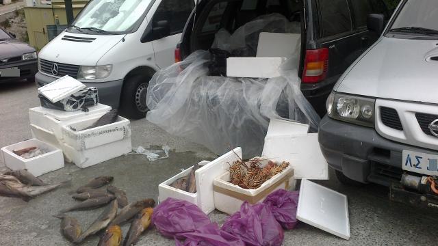 Κατόπιν ελέγχου εντοπίστηκε ποσότητα αλιευμάτων βάρους εκατόν τριάντα περίπου κιλών διαφόρων ειδών (στείρες, ροφοί, αστακοί χταπόδια, σηκιοί, φούσκες, σαργοί, μπαρμπούνια, σουπιές και ψίχα κοχυλιών), χωρίς να φέρει τα απαραίτητα παραστατικά αγοράς. Επιπλέον διαπιστώθηκε ότι σαράντα περίπου κιλά εξ’αυτών ήταν υπολειπόμενων διαστάσεων, ενώ το σύνολό τους έφερε εμφανή σημάδια από χρήση ψαροντούφεκου με εξαίρεση τα αστακοειδή.