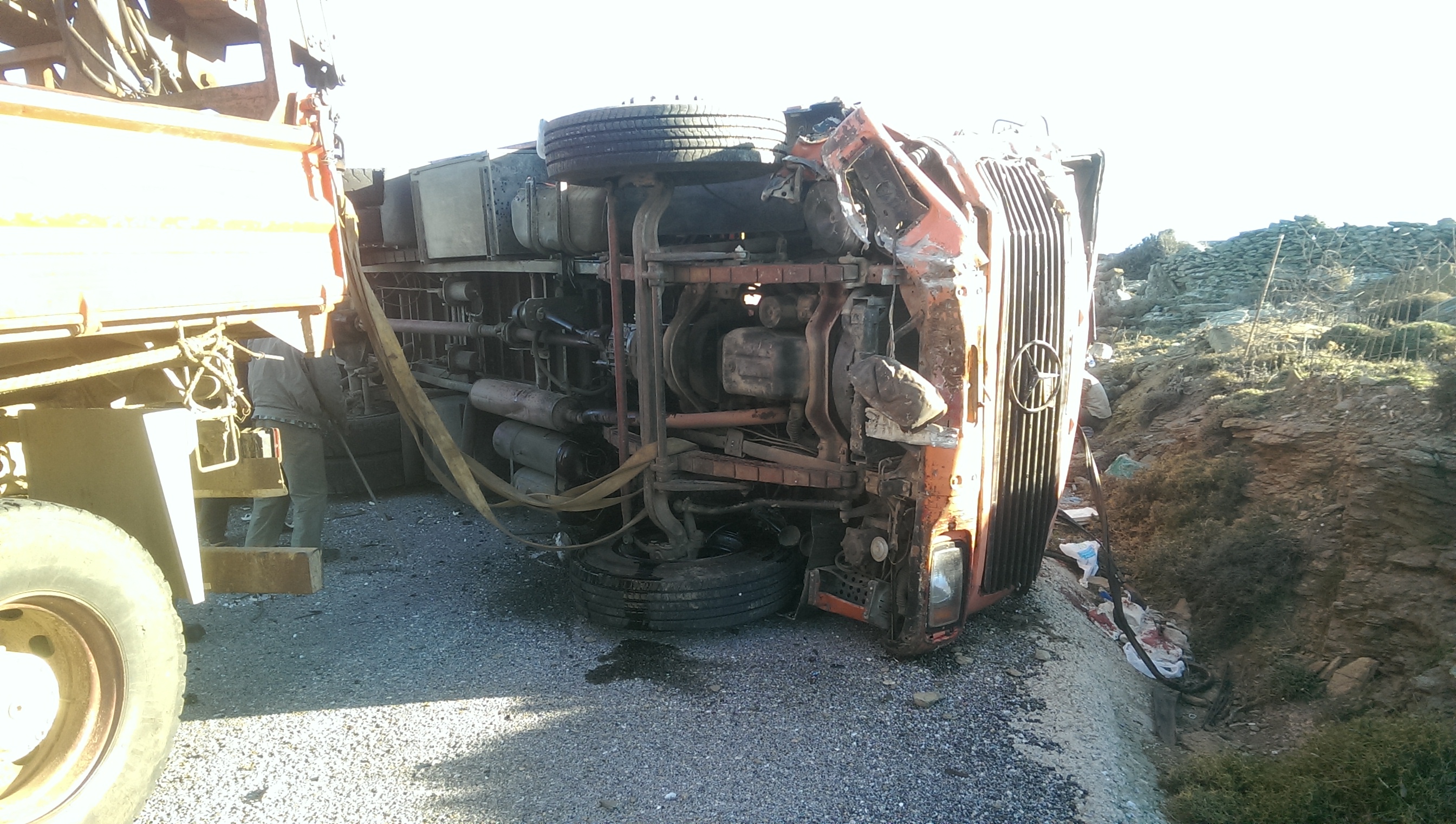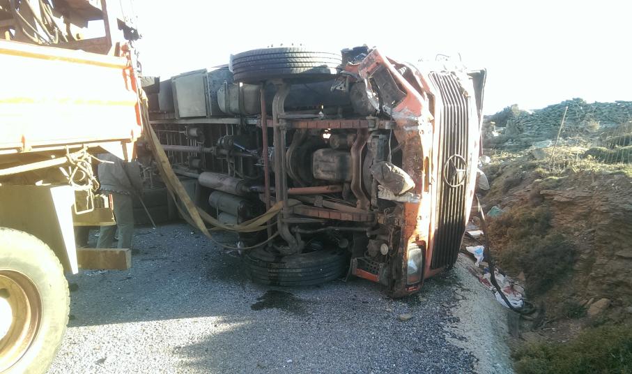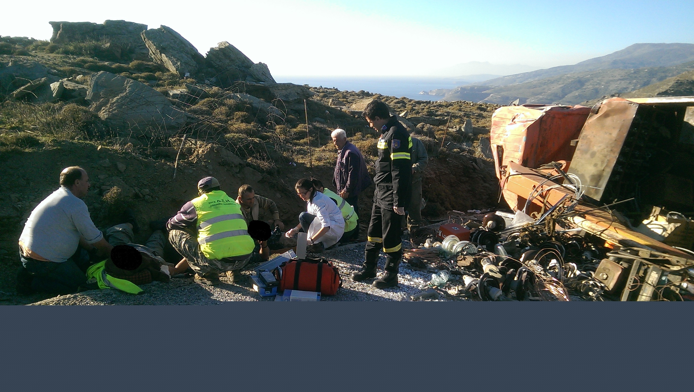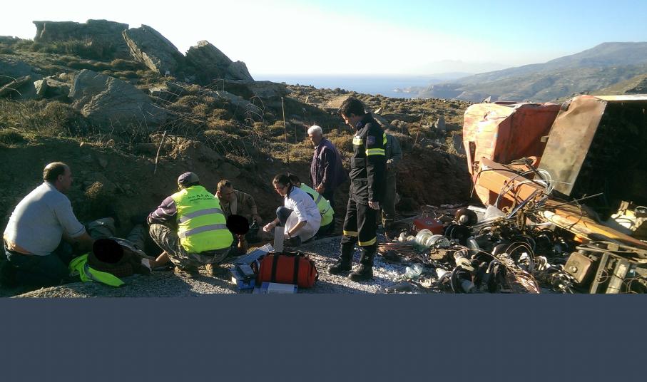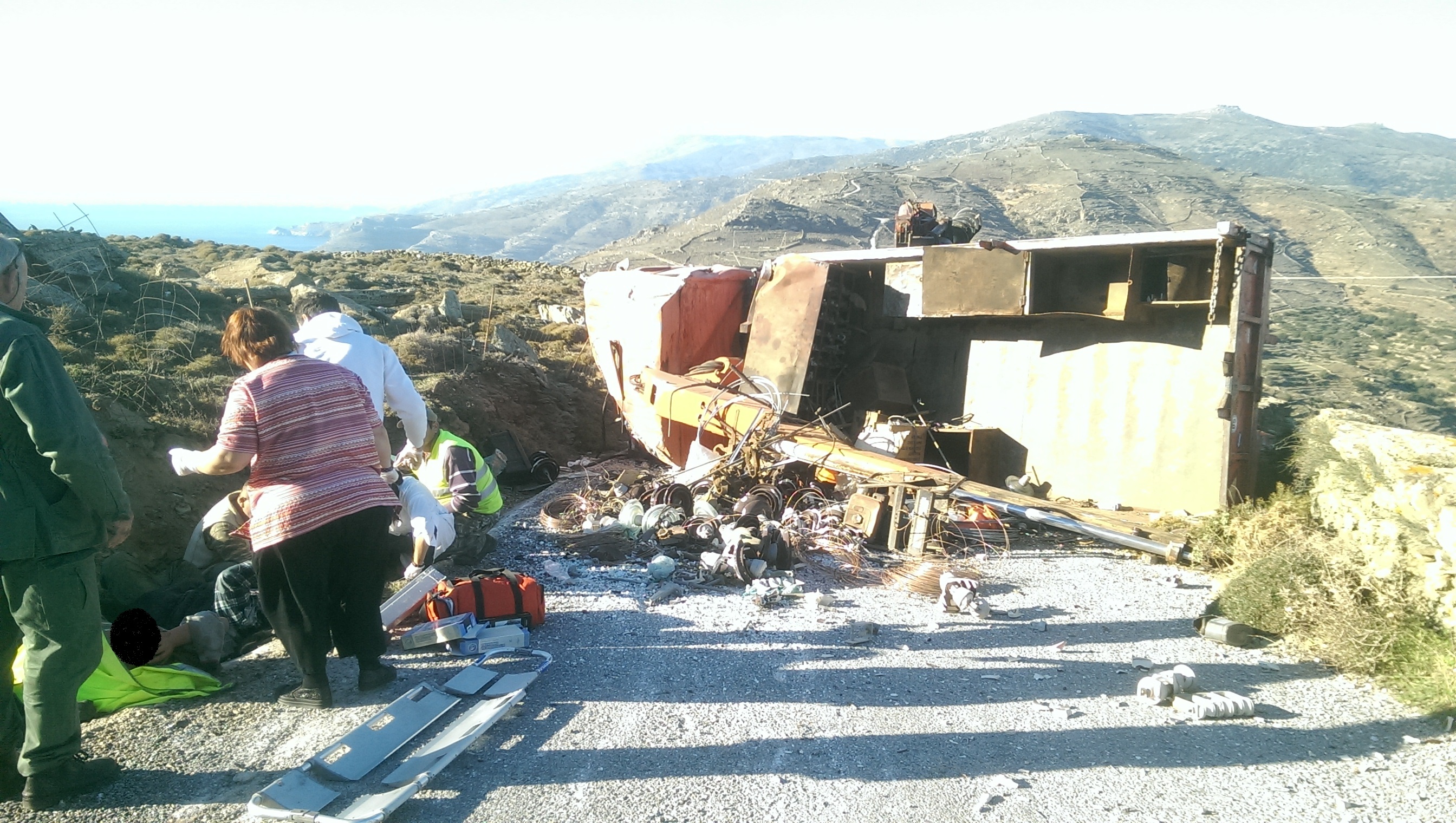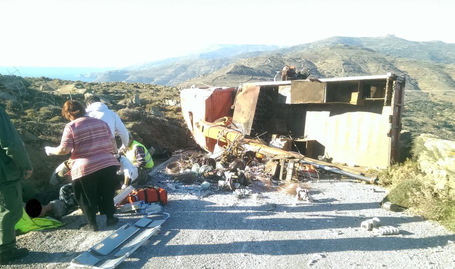 «Σήμερα Τετάρτη 4 Νοεμβρίου 2015 και περί Ω/15:00 περίπου ενημερώθηκε η Υπηρεσία μας για παροχή βοηθείας στην περιοχή Προφήτης Ηλίας Άνδρου και συγκεκριμένα για απεγκλωβισμό έξι (6) τραυματισμένων εργατών που επέβαιναν σε γερανοφόρο φορτηγό της Δ.Ε.Η., το οποίο ανετράπη κάτω από αδιευκρίνιστες συνθήκες. Η Υπηρεσία μας επενέβη άμεσα με δύο (2) οχήματα και πέντε (5) άνδρες του Πυρ/κού Κλιμακίου Άνδρου. Δύο (2) εκ των εργατών τραυματίστηκαν σοβαρά, ο ένας εκ των οποίων θα μεταφερθεί σε Νοσοκομείο της Αθήνας.»
