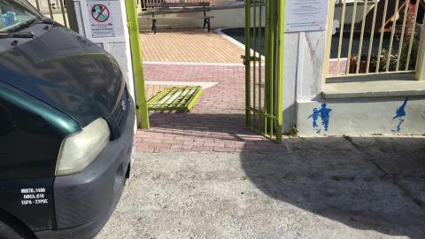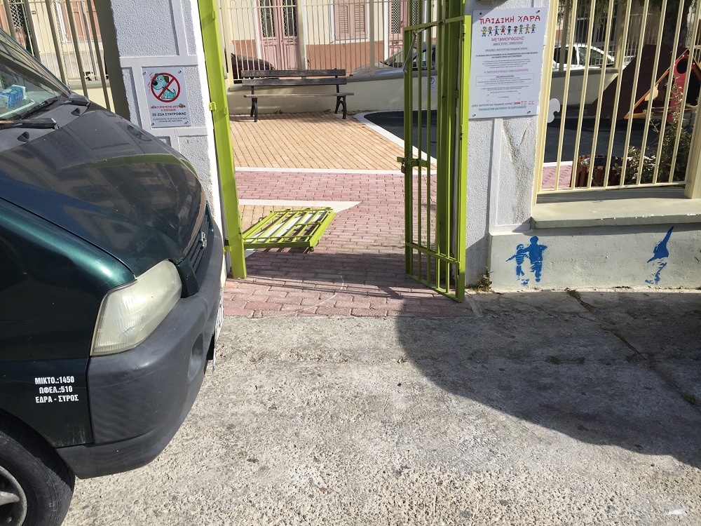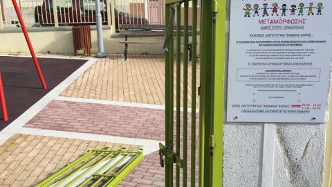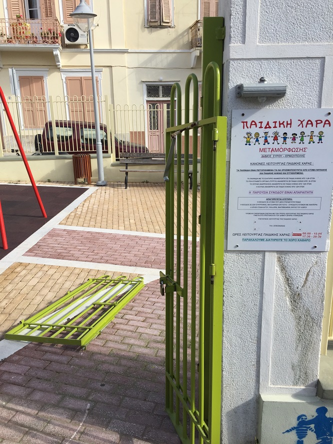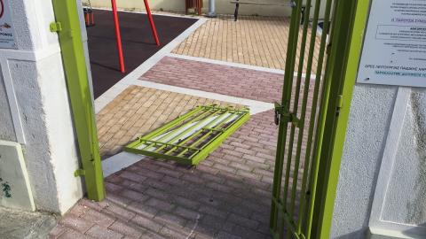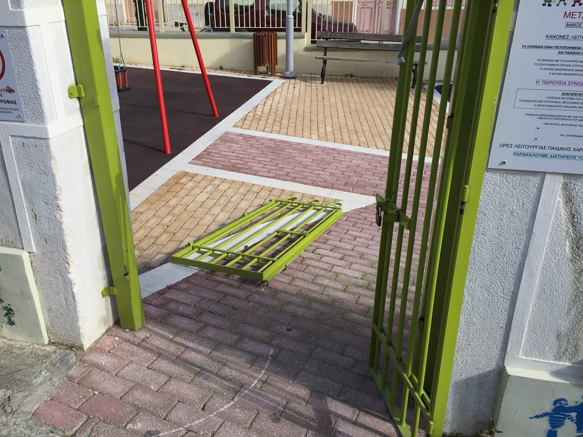 “Θύμα” νέων ανεξήγητων προθέσεων υπήρξε η παιδική χαρά Μεταμορφώσεως καθώς άγνωστοι “ξεκρέμασαν” την πόρτα εισόδου και την πέταξαν στο δάπεδο προκειμένου να εισέλθουν στον εσωτερικό χώρο αυτής.