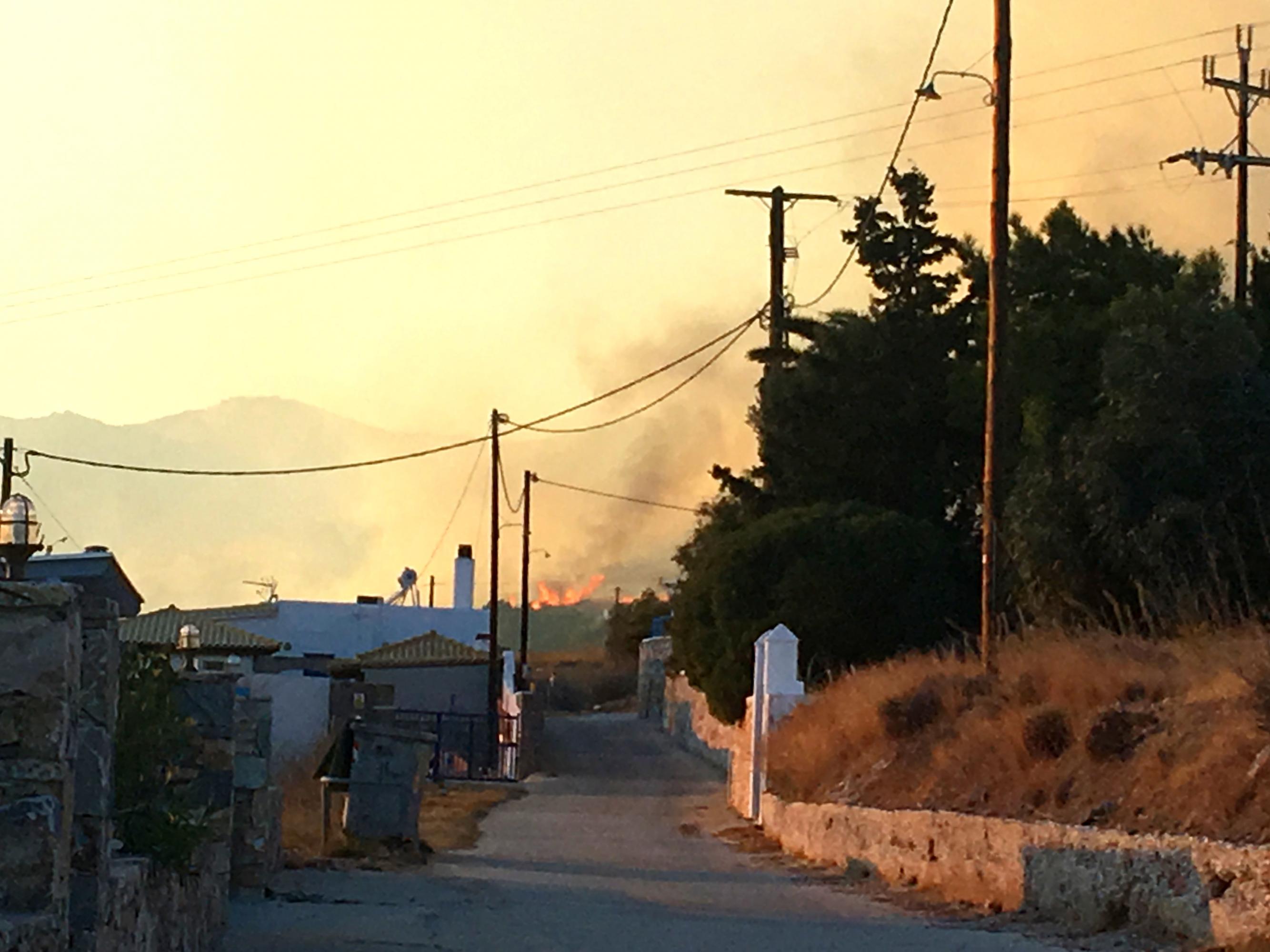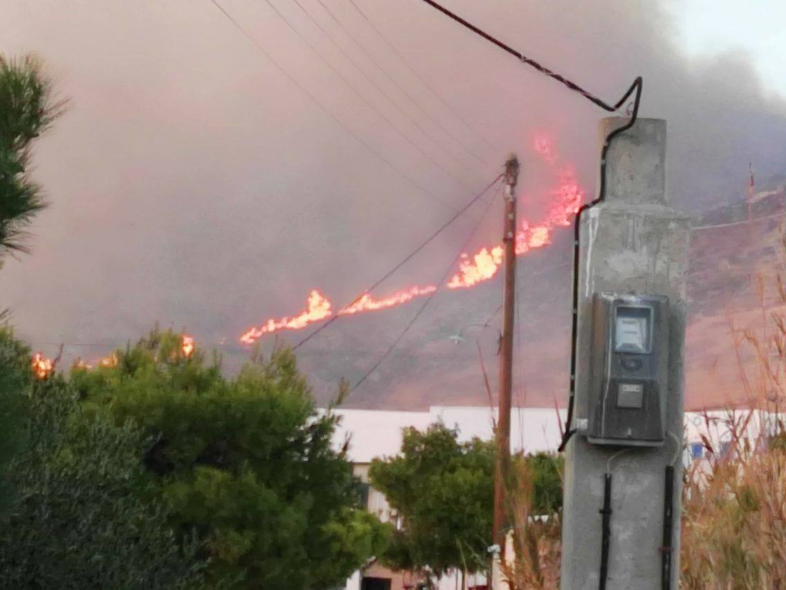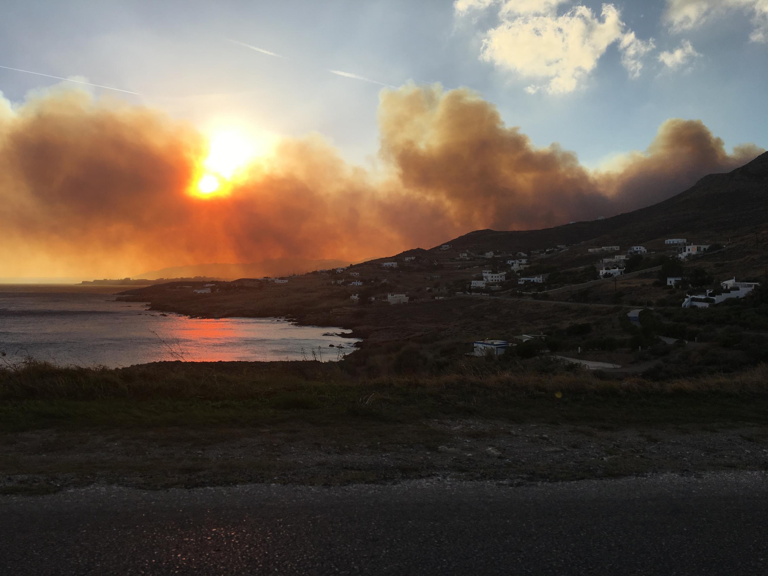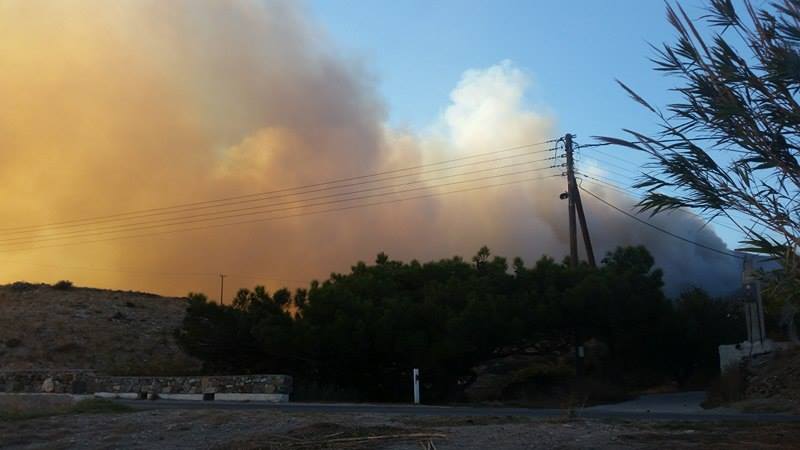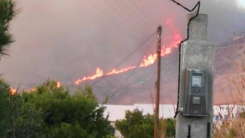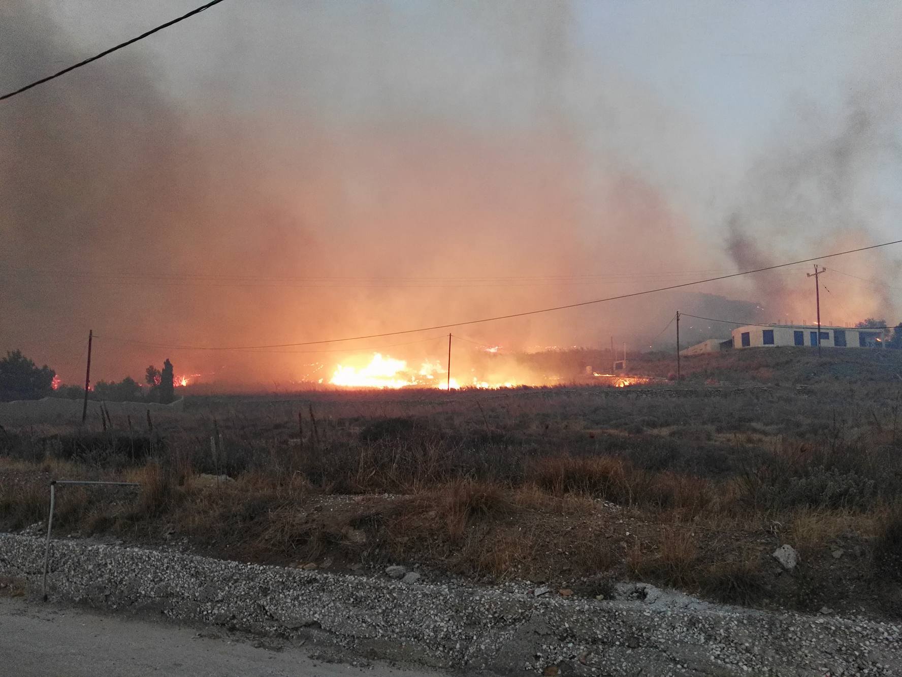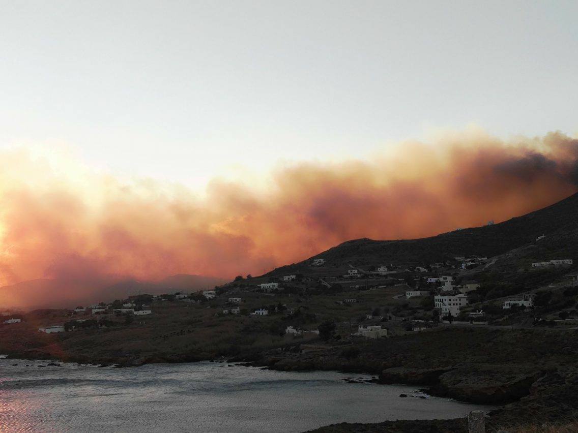 19:30 Η πυρκαγιά έφτασε έως και το χαμηλό σημείο του κεντρικού δρόμου στο Μέγα Γιαλό, ενώ από νωρίς επεκτάθηκε, λόγω των ριπών του ανέμου, στην Αμπέλα και τα Τρία Λαγγόνια. Αυτή τη στιγμή συνεχίζει να επεκτείνεται προς Άδειατα.