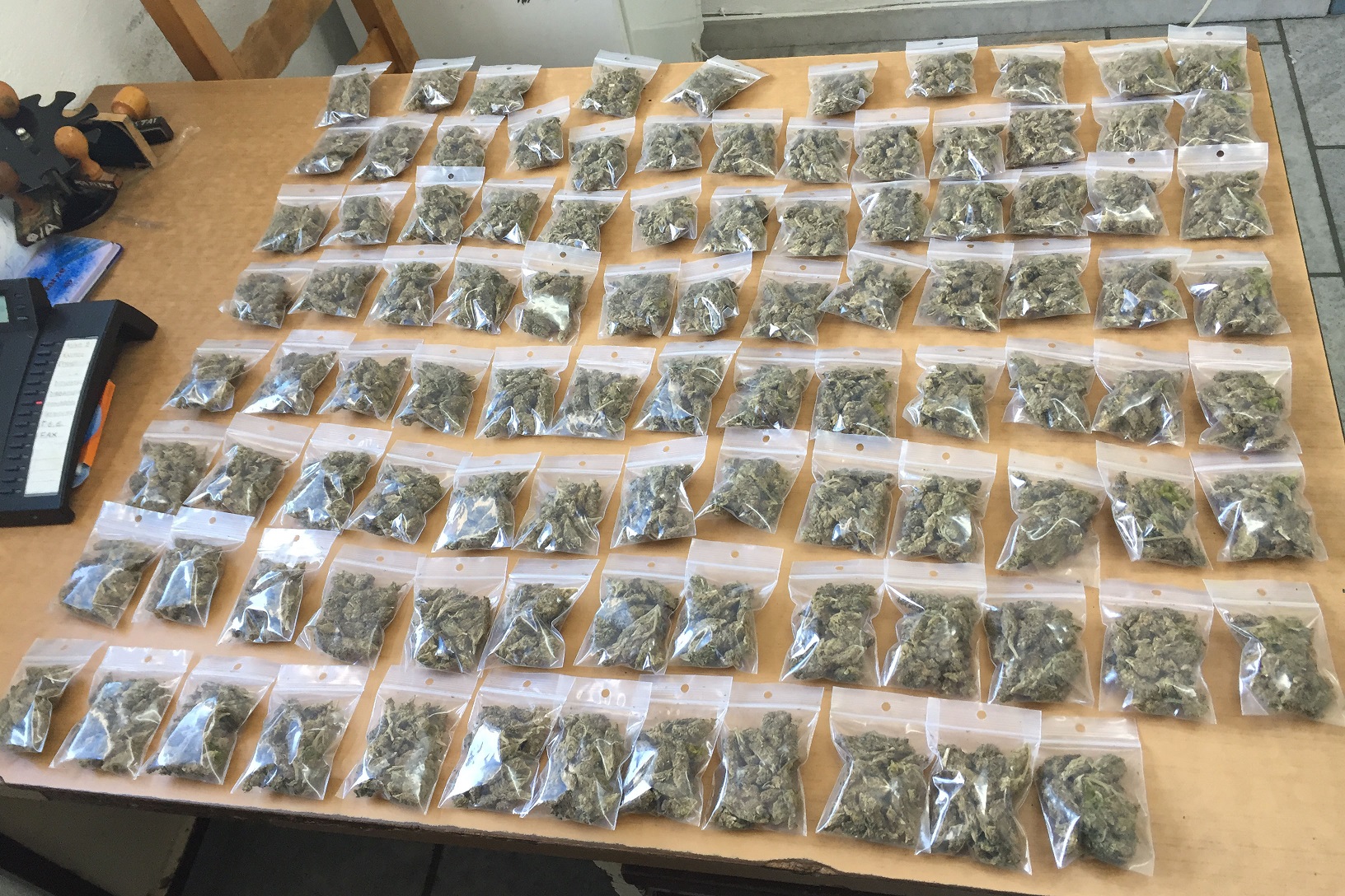 Κατά την αστυνομική έρευνα βρέθηκαν στο χώρο της αποθήκης και κατασχέθηκαν εκατό αυτοσχέδιες ισοβαρείς - ισομεγέθεις πλαστικές συσκευασίες περιέχουσες ακατέργαστη κάνναβη συνολικού βάρους -750- γραμμαρίων.
