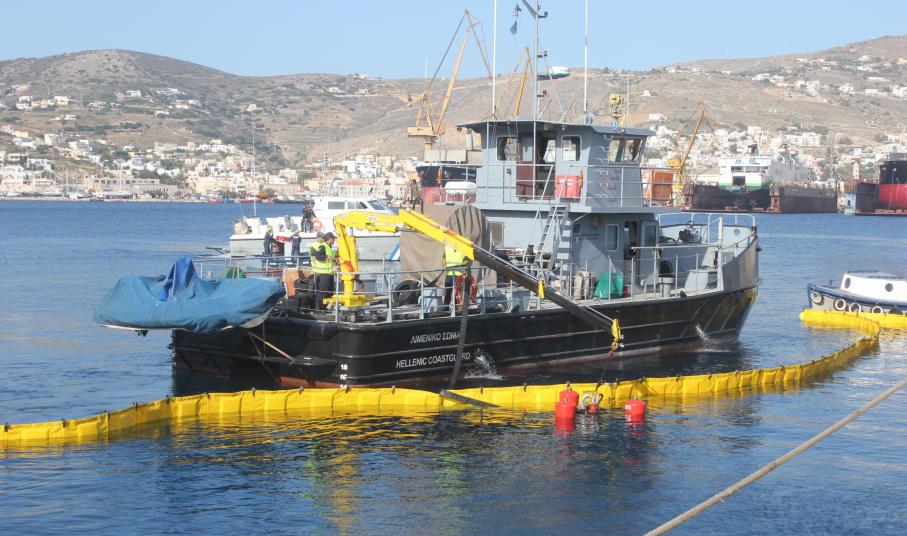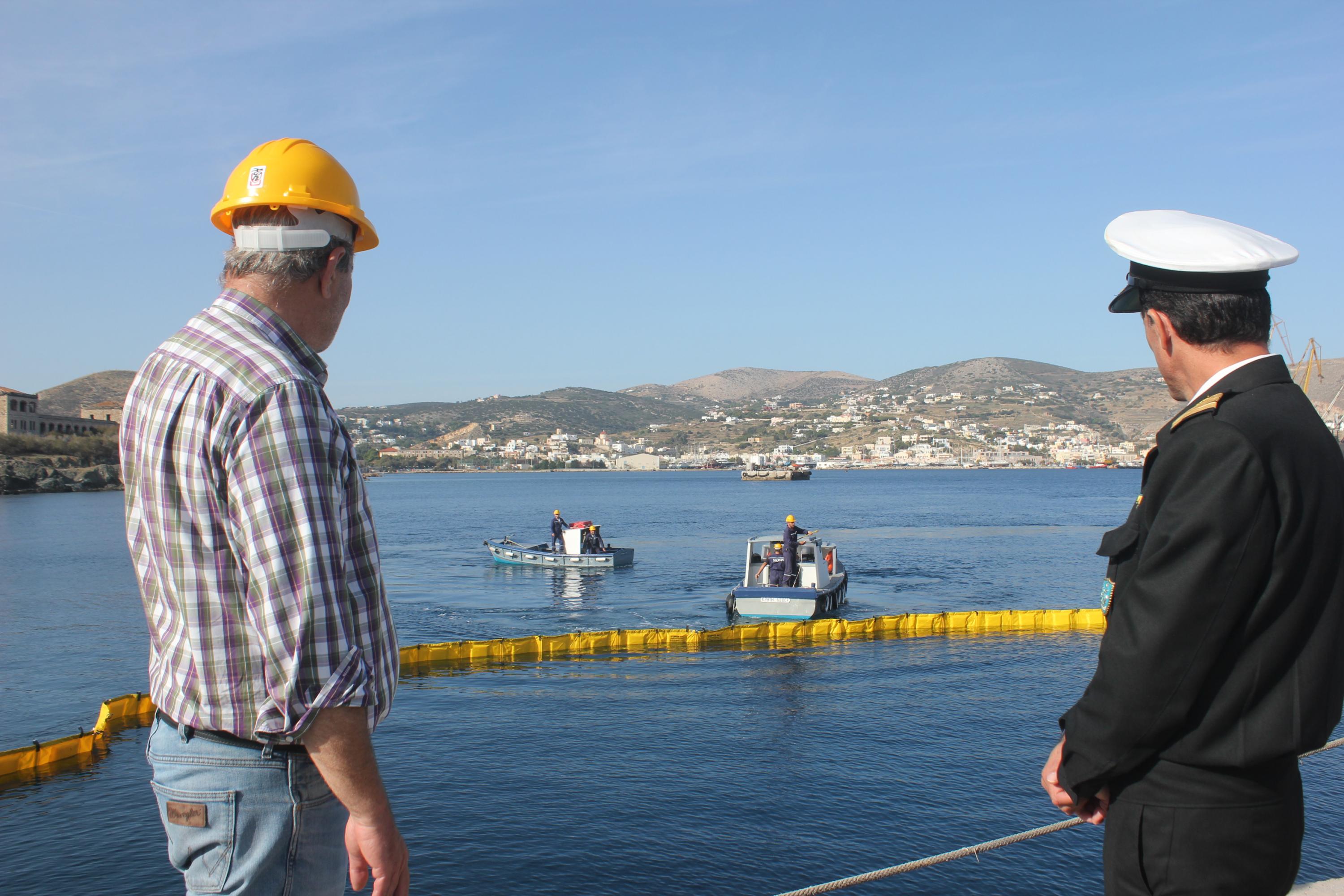 “Η ΣΕΚΑΒΙΝ με το προσωπικό που έχει διαθέσει, αναπτύσσει το φράγμα. Το σενάριο της άσκησης θέλει κατά την διαδικασία εμπορικής πράξης δεξαμενόπλοιου που λειτουργεί για τις ανάγκες της επιχείρησης να έχει επιφέρει μία ατυχηματική ρύπανση. Έχει ενεργοποιηθεί όλος ο μηχανισμός. Η επιχείρηση διαθέτει τα μέσα της, ενεργοποιεί το προσωπικό της και άμεσα ενημερώνει την Υπηρεσία μας. Το Λιμεναρχείο Σύρου άμεσα ενεργοποιεί τα δικά του μέσα. Έχει φθάσει και το πλωτό το αντιρρυπαντικό του Λιμεναρχείου Σύρου (ΠΛΣ 421), που έχει μεγάλες δυνατότητες για την αντιμετώπιση περιστατικών ρύπανσης, όπως επίσης και το ταχύπλοο περιπολικό σκάφος του Λιμεναρχείου Σύρου (ΠΛΣ 603). Όλοι μαζί οι εμπλεκόμενοι αναπτύσσουν τις εργασίες που επιβάλλονται για να αντιμετωπισθεί η ρύπανση με τον καλύτερο δυνατό τρόπο” υπογράμμισε ο ίδιος, τονίζοντας πως αμέσως μετά με χρήση ειδικού εξοπλισμού (skimmer) “ανακτάται η πετρελαιοκηλίδα για να απομακρυνθεί”.