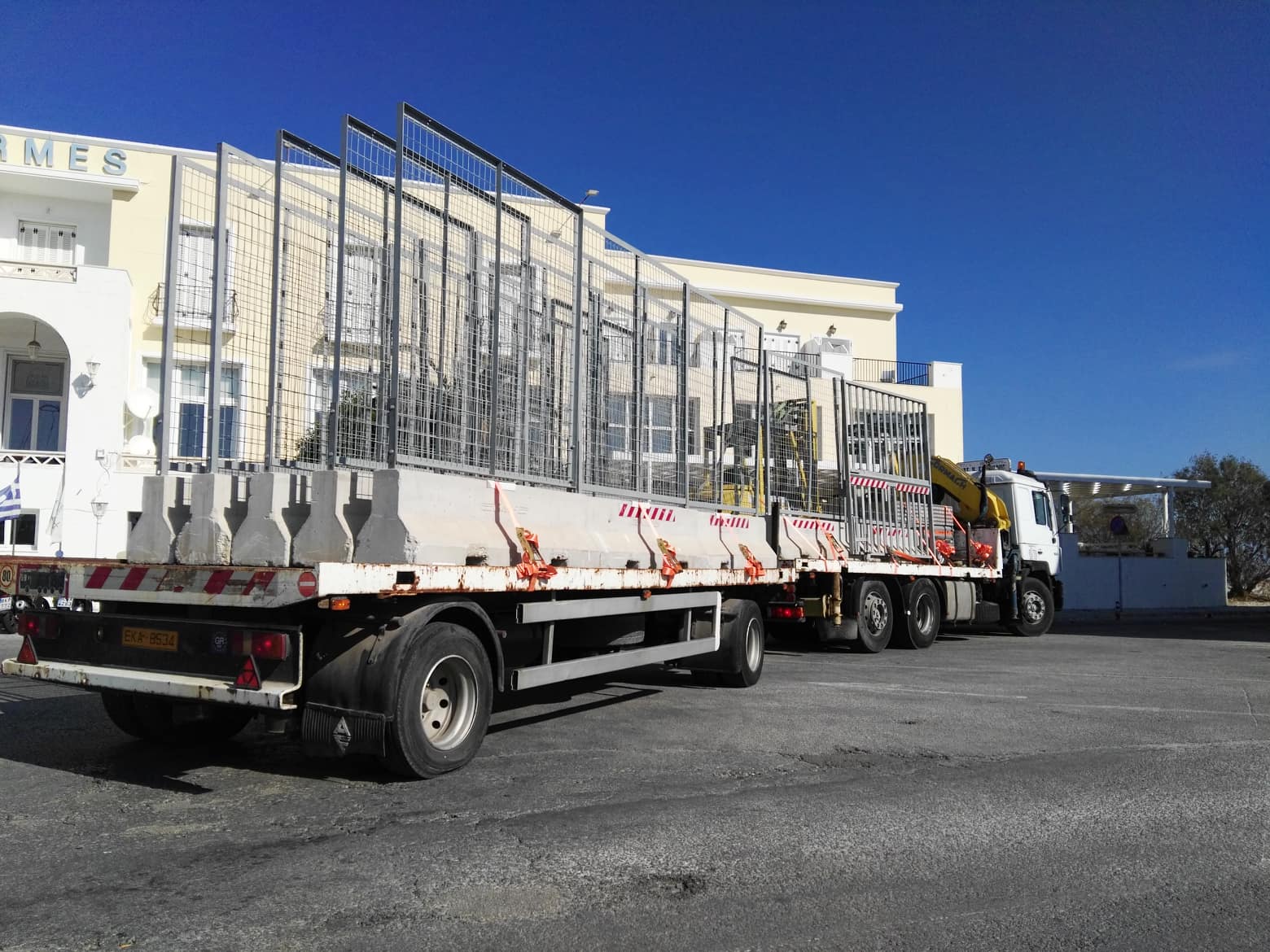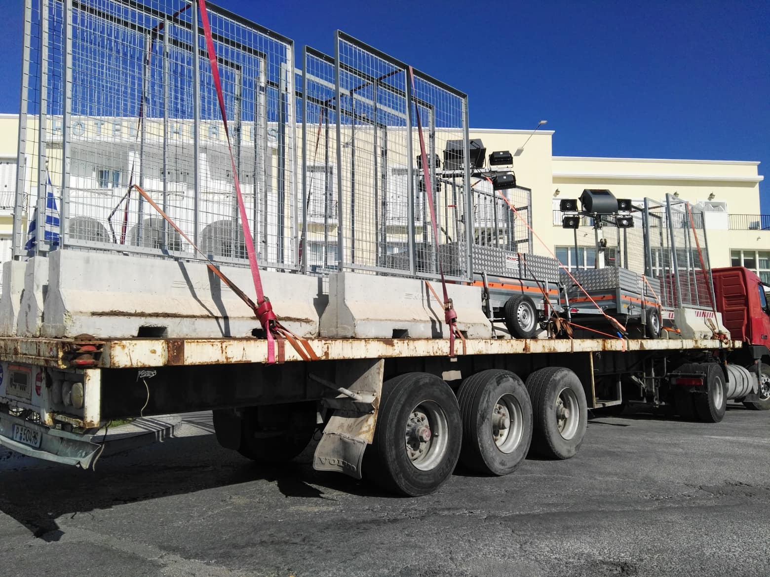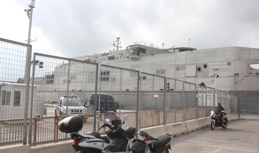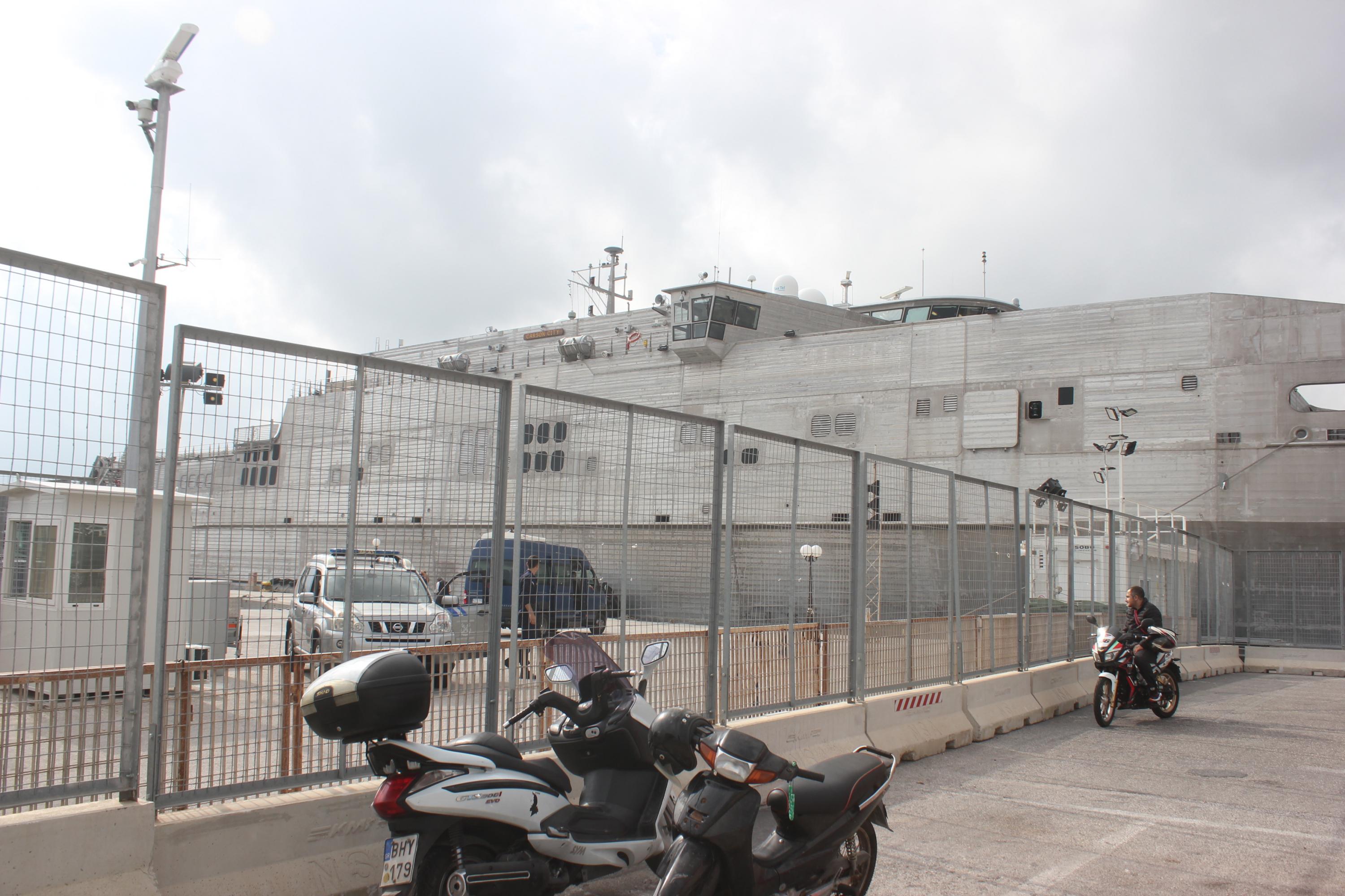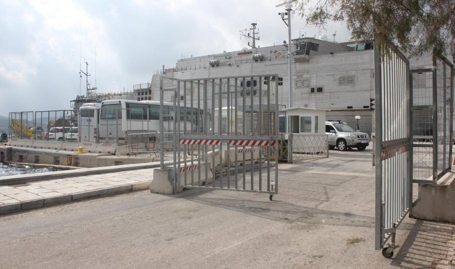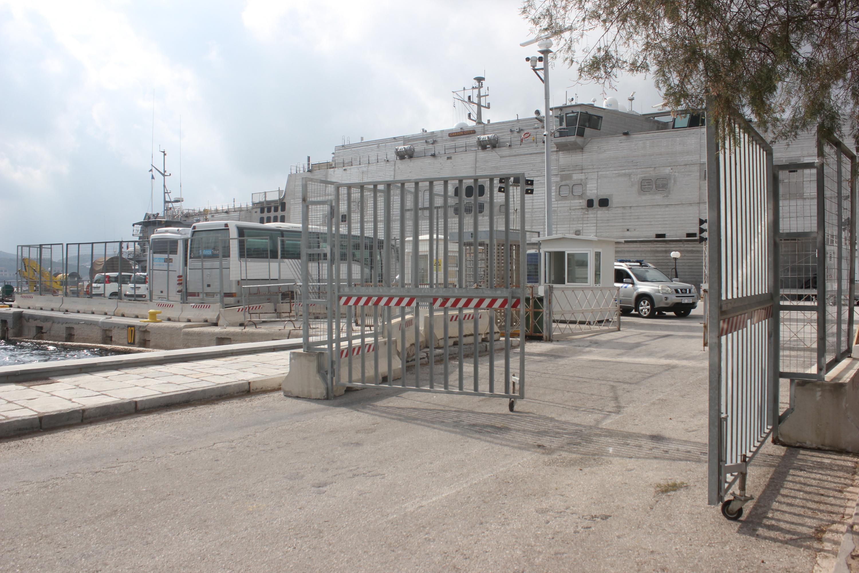 Περιμετρικά του χώρου που έχει δέσει το καταμαράν έχουν τοποθετηθεί από χθες ειδικά κιγκλιδώματα που μεταφέρθηκαν από την Αθήνα, στο πλαίσιο λήψης υψηλών μέτρων ασφαλείας.