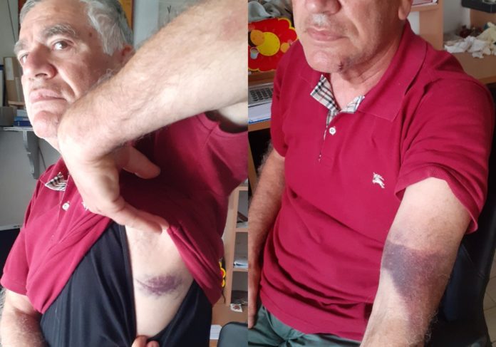 «Περπατούσα προς το αυτοκίνητό μου τελείως μόνος όταν μια ομάδα αστυνομικών με χακί ρούχα, ασπίδες, κράνη και γιλέκα ήταν συγκεντρωμένοι στην άκρη του δρόμου. Μόλις με είδαν απλώθηκαν σε όλο το πλάτος του δρόμου και μου φώναξαν «που πας;» Τους είπα ότι φεύγω και πηγαίνω στο σπίτι μου στα Μελισσιάτικα και πως έχω το αυτοκίνητό μου πίσω τους. Μου φώναζαν «μην μας προκαλείς, μην μας προκαλείς» κι εγώ έλεγα πως θέλω μόνο να φύγω γιατί μένω πιο πάνω. Συνέχιζαν να μου φωνάζουν και φτάνοντας αμέριμνος ένα μέτρο μακριά τους, τους είπα «απαγορεύεται να πάω σπίτι μου;». Τότε ο επικεφαλής αυτής της ομάδας, που δεν φορούσε κράνος, μου επιτέθηκε λέγοντάς μου «γιατί προκαλείς ρε» κι άρχισε να με απωθεί με την ασπίδα. Άλλοι τρεις έπεσαν πάνω μου και με χτυπούσαν με τις ασπίδες τους, ώσπου έπεσα κάτω. Έβαλα τα χέρια μου στο κεφάλι προσπαθώντας να προστατευτώ και τρομοκρατημένος φώναζα ότι είμαι περαστικός και πηγαίνω στο σπίτι μου. Συνέχισαν να με χτυπούν, μου τράβηξαν και μου έσκισαν την μπλούζα μου. Εκείνη τη στιγμή κάποια παιδιά που βρίσκονταν στη Διεύθυνση με είδαν και έτρεξαν φωνάζοντας να με αφήσουν. «Αφήστε τον άνθρωπο. Περαστικός- άσχετος είναι, στο σπίτι του πηγαίνει», έλεγαν. Με παράτησαν κι άρχισαν να κυνηγούν αυτούς», λέει στο magnesianews.gr ο κ. Χατζηαντωνίου με φωνή που τρέμει και μάτια που γεμίζουν δάκρυα.