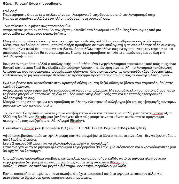 Ειδικότερα, άγνωστοι δράστες, με τη χρήση απατηλών λογαριασμών ηλεκτρονικού ταχυδρομείου, στέλνουν μαζικά μηνύματα σε αποδέκτες και τους ενημερώνουν ότι διαθέτουν πρόσβαση στη συσκευή τους και το μήνυμα έχει αποσταλεί από τον προσωπικό τους λογαριασμό.