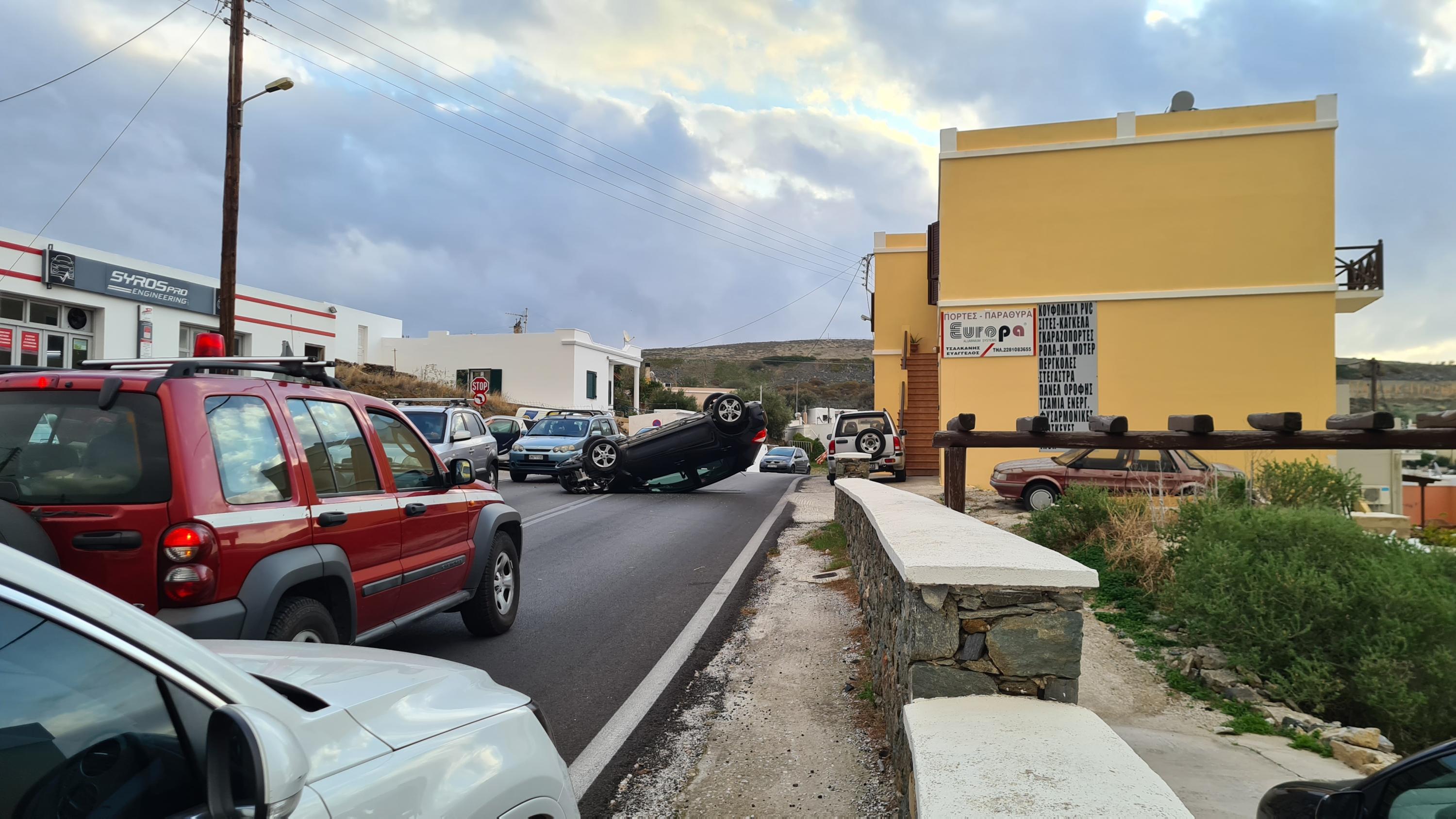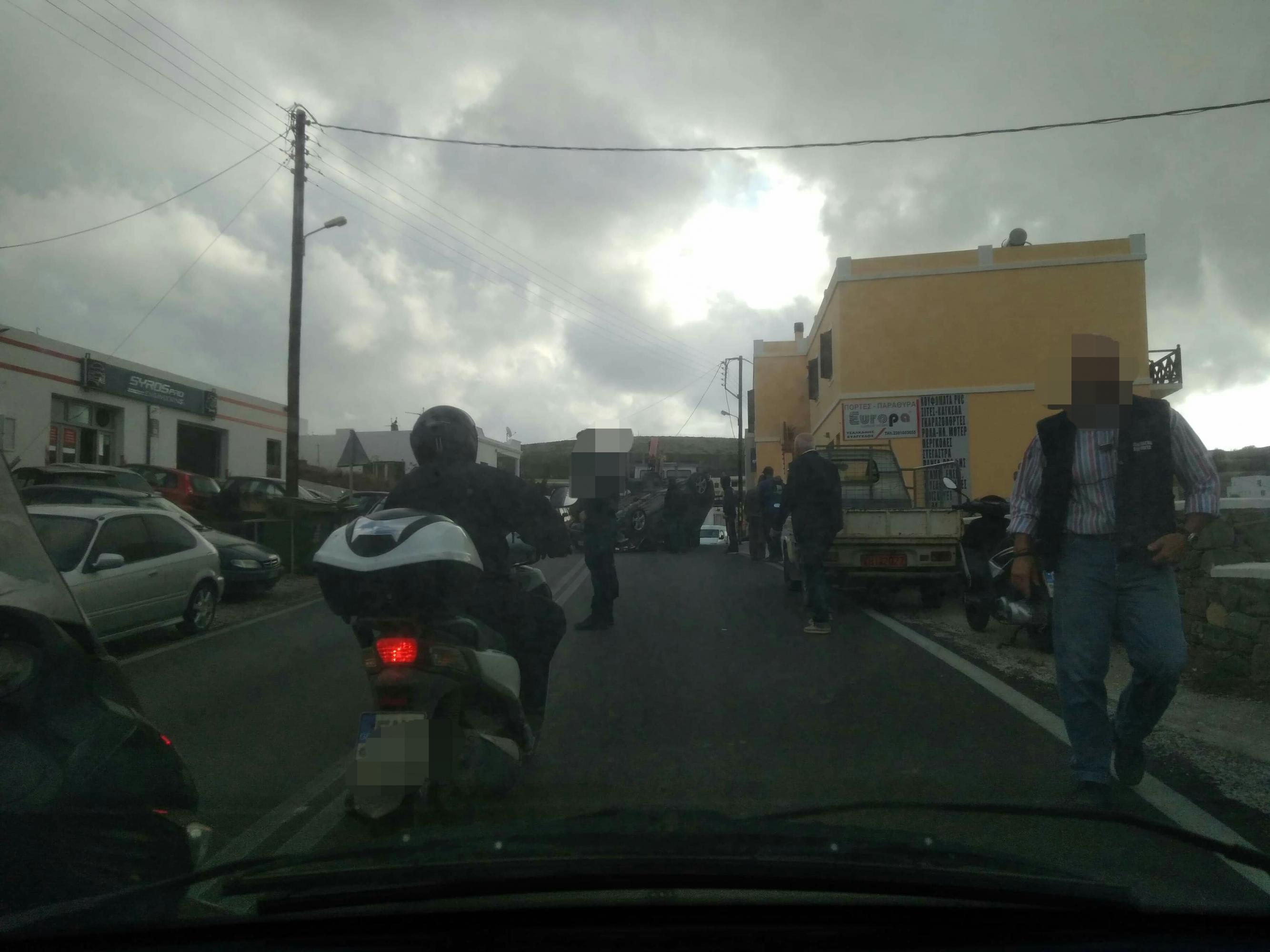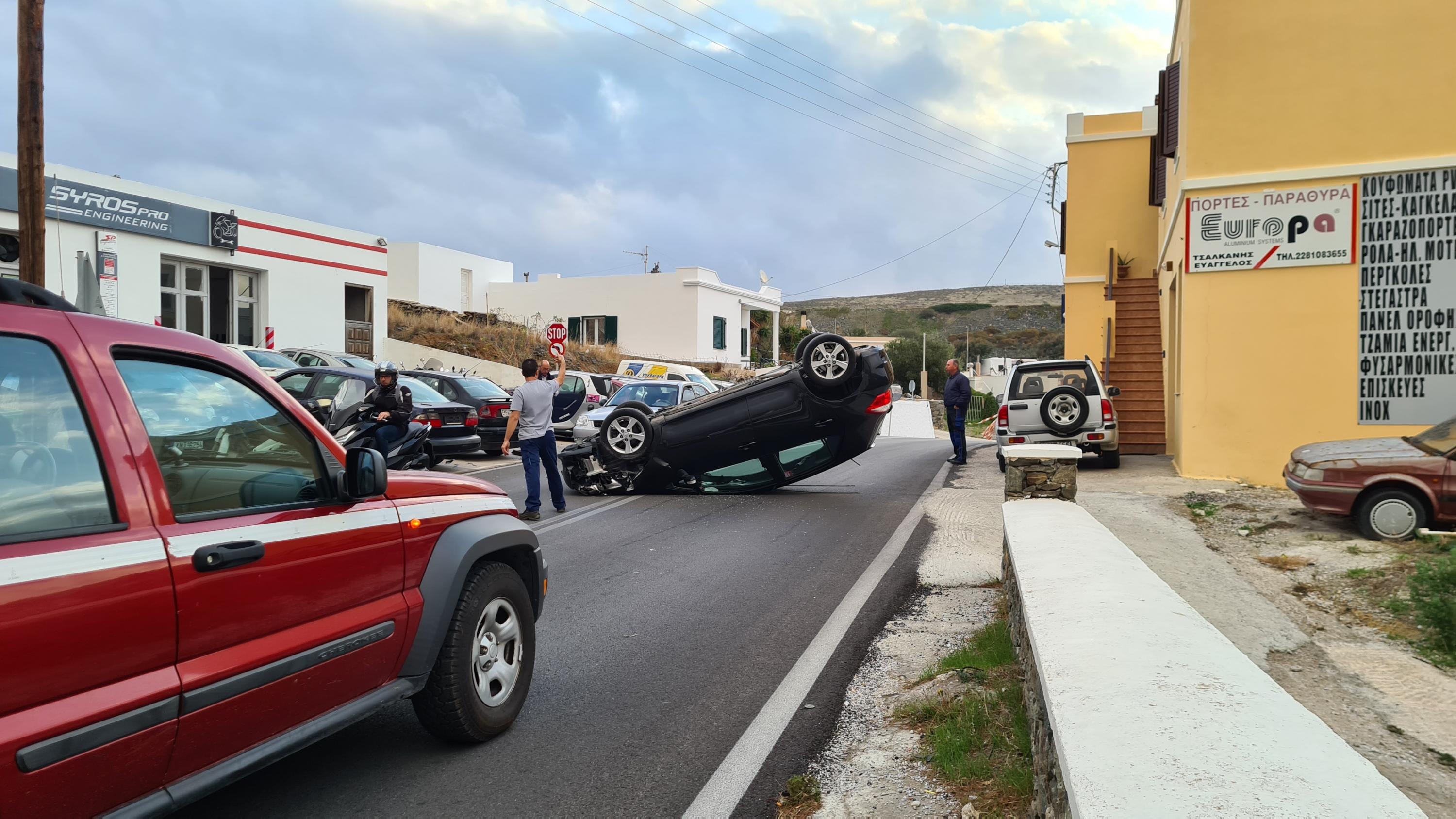 Σήμερα το πρωί, λίγο πριν τις 8 πμ στο Μάννα, κοντα το σχολείο, στο ρεύμα καθόδου με κατεύθυνση προς Ερμούπολη, αυτοκίνητο του οποίου ο οδηγός προσπάθησε να αποφύγει σταθμευμένο όχημα, προσέκρουσε ελαφρά πάνω του και μετα απο ανεξέλεγκτο ελιγμό, ανετράπη.
