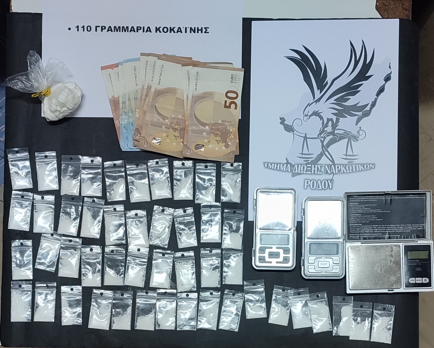 Κοκαΐνη, συνολικού βάρους 110 γραμμάρια (εκ των οποίων τα 40 γραμμάρια ανισομερώς μοιρασμένα σε 47 συσκευασίες έτοιμες προς διάθεση)