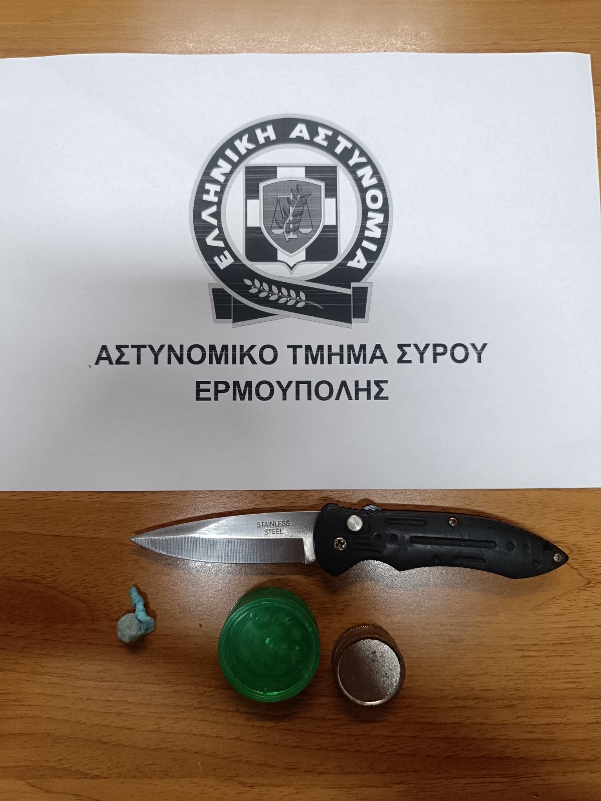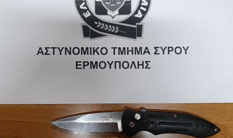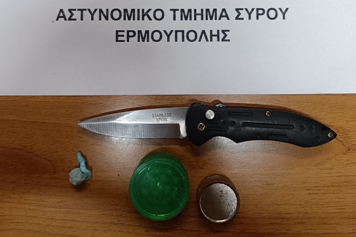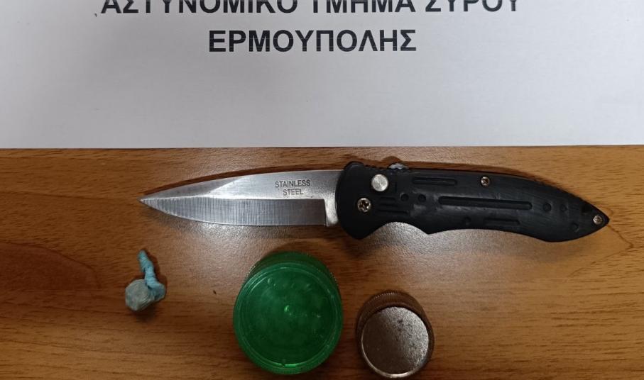 Την Πέμπτη 04 Ιουλίου 2024 το απόγευμα συνελήφθη στη Σύρο, από περιπολούντες αστυνομικούς του Αστυνομικού Τμήματος Σύρου-Ερμούπολης, 16χρονος ημεδαπός στην κατοχή του οποίου βρέθηκαν και κατασχέθηκαν πτυσσόμενο μαχαίρι με λάμα -9- εκατοστών, μικροποσότητα ακατέργαστης κάνναβης και -2- θρυμματιστές κάνναβης. Σε βάρος του σχηματίσθηκε δικογραφία σε συνεργασία με το Τμήμα Ασφαλείας Σύρου-Ερμούπολης.