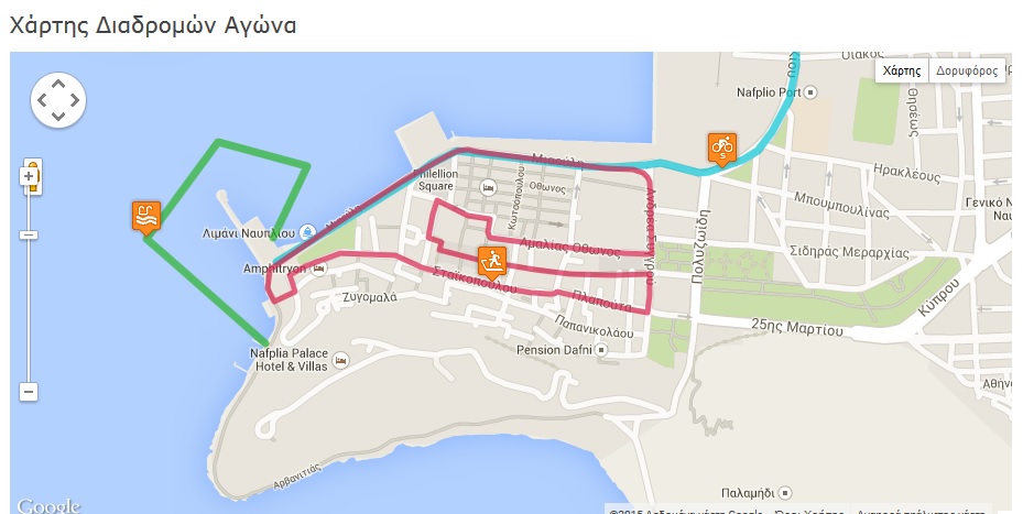 Εκκίνηση: φάρος-λιμάνι Ναυπλίου, Τερματισμός : φάρος- λιμάνι Ναυπλίου, Διαδρομή: κολύμβηση (τριγωνική διαδρομή ορισμένη με σημαδούρες), ποδηλασία (1 κύκλος 20 χλμ), τρέξιμο (2 κύκλοι 2,5 χλμ), Ώρα εκκίνησης: 9.00 πμ. Σκυταλοδρομία: ομάδες 2 ή 3 αθλητών.