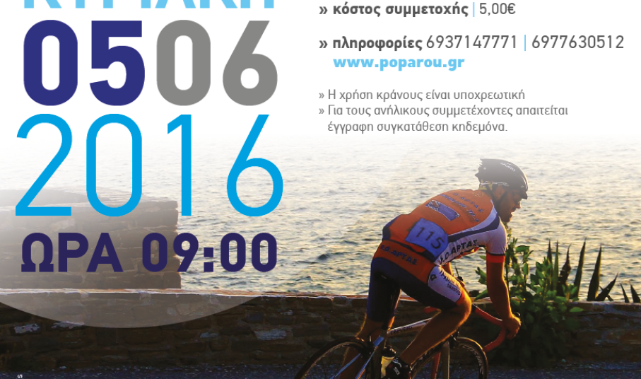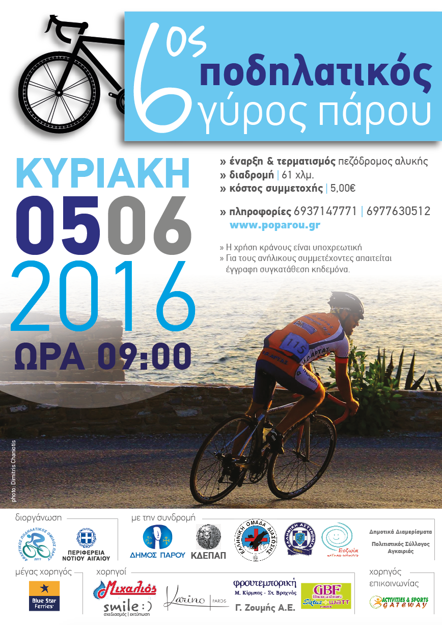 Ο Αθλητικός Ποδηλατικός Όμιλος Πάρου με την υποστήριξη του Δήμου Πάρου και της Κ.Δ.Ε.Π.Α.Π. διοργανώνει τον 6ο Ποδηλατικό γύρο Πάρου, απόστασης 61 χλμ που θα πραγματοποιηθεί την Κυριακή 05 Ιουνίου 2016 στις 09:00.