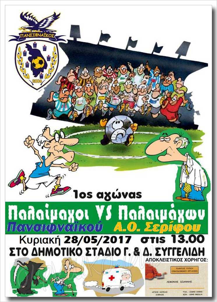 Ο 1ος Αγώνας Παλαιμάχων του Πανσιφναϊκού ενάντια στους Παλέμαχους του Α.Ο. Σερίφου, πρόκειται να πραγματοποιηθεί την Κυριακή 28/5/2017 στις 13.00 στο Δημοτικό Στάδιο Γ. και Δ. Συγγελίδη στη Σίφνο.