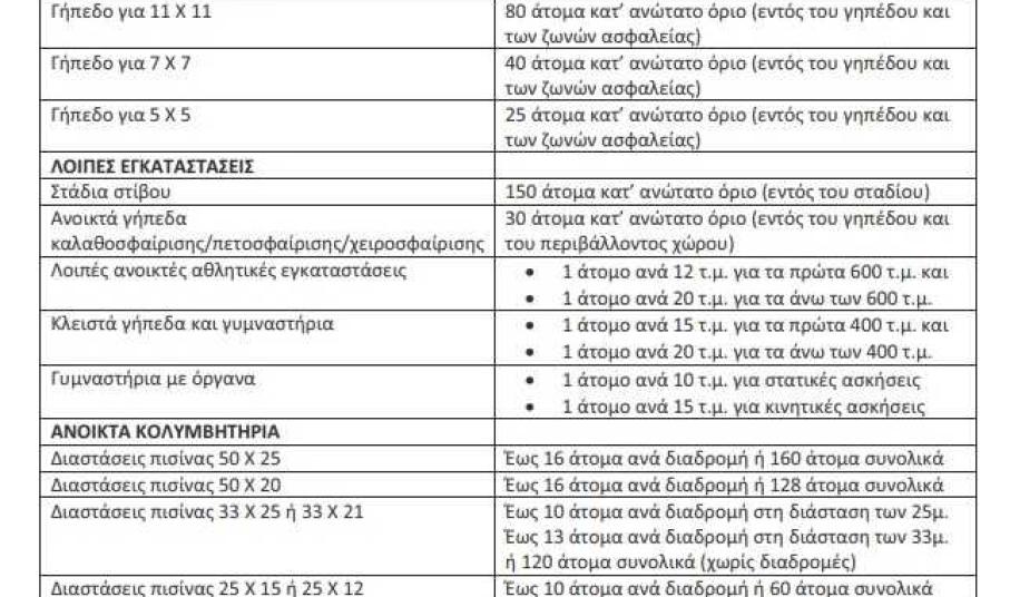 Ο μέγιστος αριθμός αθλητών και αθλούμενων στις αθλητικές εγκαταστάσεις άνω των 150 τ.μ. περιορίζεται στο 75% αυτών που αναφέρονται στον Πίνακα του παραρτήματος VII της υπ’ αριθμ. Δ1α/Γ.Π.οικ. 56435 (ΦΕΚ Β’ 3958 15/09/2020) ΚΥΑ (https://gga.gov.gr/images/KYA_3165_31.07.2020.pdf).