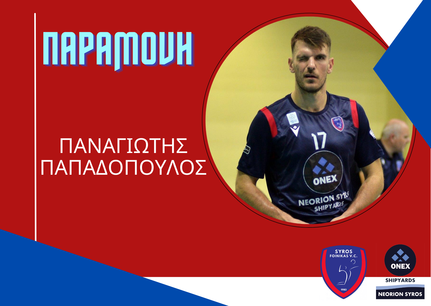 Ο Φοίνικας Σύρου ΟΝΕΧ ανακοινώνει τη συνέχιση της συνεργασίας με τον Παναγιώτη Παπαδόπουλο για τη σεζόν 2022-23. Αυτή θα είναι η 5η χρονιά του πατρινού ακραίου στο νησί της Σύρου, «ισοφαρίζοντας» τον Ηλία Λάππα, ως οι μακροβιότεροι επαγγελματίες αθλητές στον Φοίνικα Σύρου.