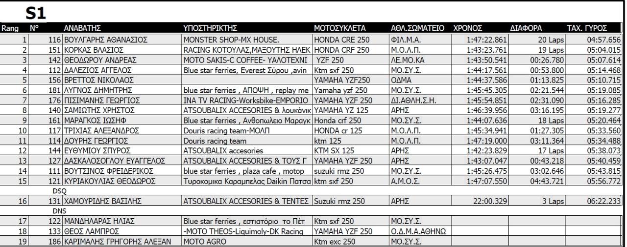 Κατηγορίες: S1, μοτοσυκλέτες 2Τ έως 144 cc και 4Τ έως 250cc και δικαίωμα συμμετοχής είχαν αθλητές 15 ετών και άνω, Μαύρο φόντο-Λευκοί αριθμοί που ξεκινούν με το ψηφίο 1.