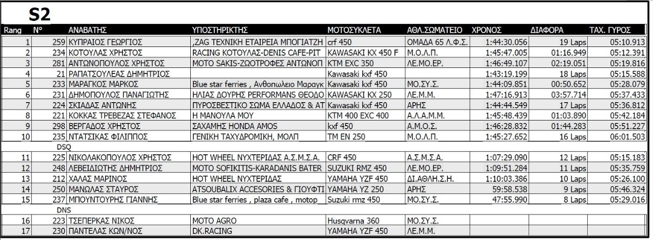 S2, μοτοσυκλέτες 2Τ από 175 cc και άνω, 4Τ 275cc και άνω και δικαίωμα συμμετοχής είχαν αθλητές από 15 ετών και άνω. Κόκκινο φόντο-Λευκοί αριθμοί που ξεκινούν με το ψηφίο 2.