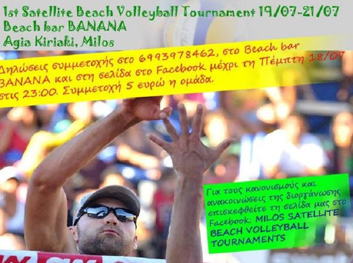 Ξεκινά την Παρασκευή στη Μήλο το τουρνουά Beach Volley με την επωνυμία “Satellite Beach Volleyball”. Οι αγώνες θα πραγματοποιηθούν στην παραλία της Αγίας Κυριακής. Η διάρκεια του τουρνουά τριών ημερών, δηλαδή από την Παρασκευή έως και την Κυριακή με τη διεξαγωγή των τελικών. Όσες ομάδες θέλουν να πάρουν μέρος, έχουν ικαίωμα να δηλώσουν συμμετοχή έως σήμερα στις 23:00 το βράδυ.