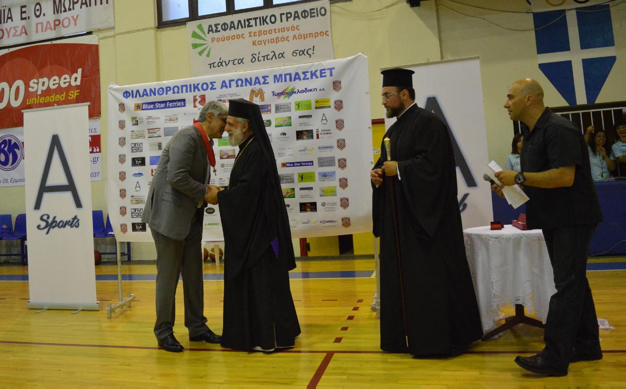 Την αρχή των βραβεύσεων έκανε ο Μητροπολίτης Σύρου κ. Δωρόθεος Β', καθώς λίγο πριν την έναρξη του αγώνα τίμησε τον Παναγιώτη Γιαννάκη με τον Σταυρό της Αγίας Μεθοδίας. Στη συνέχεια οι βετεράνοι καλαθοσφαιριστές Ελλάδας τίμησαν τον Μητροπολίτη Σύρου με τιμητική πλακέτα, αλλά και με μία εμφάνιση με όλες τις υπογραφές των αθλητών.
