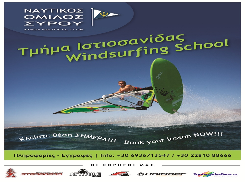 Ο Ναυτικός Όμιλος Σύρου πρόσθεσε όπως φαίνεται ένα ακόμη τμήμα στα ήδη υπάρχουν, αφού πλέον ο όμιλο ανακοίνωσε την έναρξη του Τμήματος Ιστιοσανίδας (Windsurfing), με ημερομηνία έναρξης μαθημάτων το Σάββατο 9 Μαΐου 2015 στην πανέμορφη ακτή Βούλγαρη στον Φοίνικα.