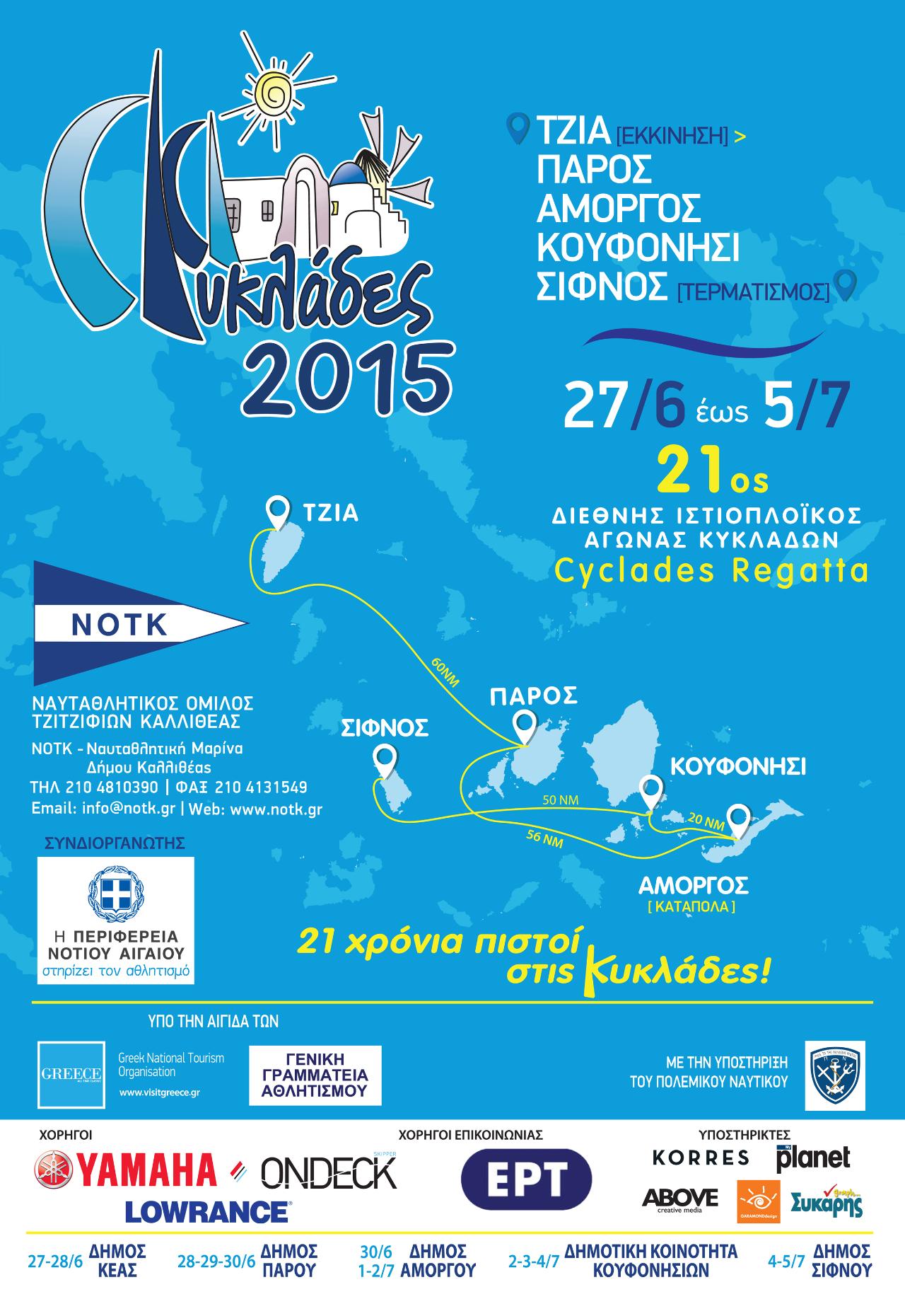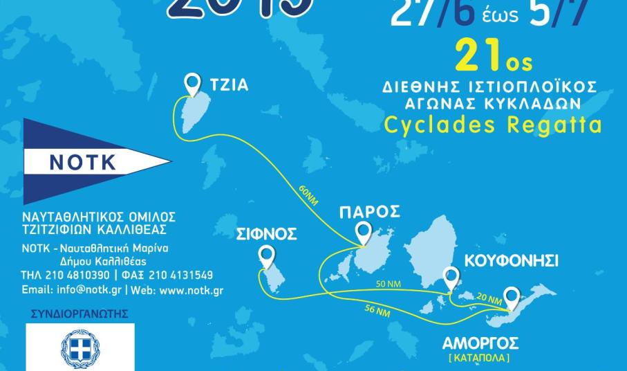 Ο 21ος Διεθνής Ιστιοπλοϊκός Αγώνας “CYCLADES REGATTA 2015 του ΝΟΤΚ καινοτομεί φέτος! Εκκινεί από την Τζιά και τερματίζει στη Σίφνο, αυξάνοντας τα νησιά-σταθμούς που παραδοσιακά επισκέπτεται το Cyclades Regatta από 3 σε 5.Τα ελληνικά και αλλοδαπά σκάφη με τα πληρώματά τους των κατηγοριών (ORCi, ORC Club, ORC ClubNonSpinnaker και IRC), θα εκκινήσουν από την Τζιά, θα πλεύσουν προς Πάρο, Αμοργό, Κουφονήσι και θα τερματίσουν στην Σίφνο.