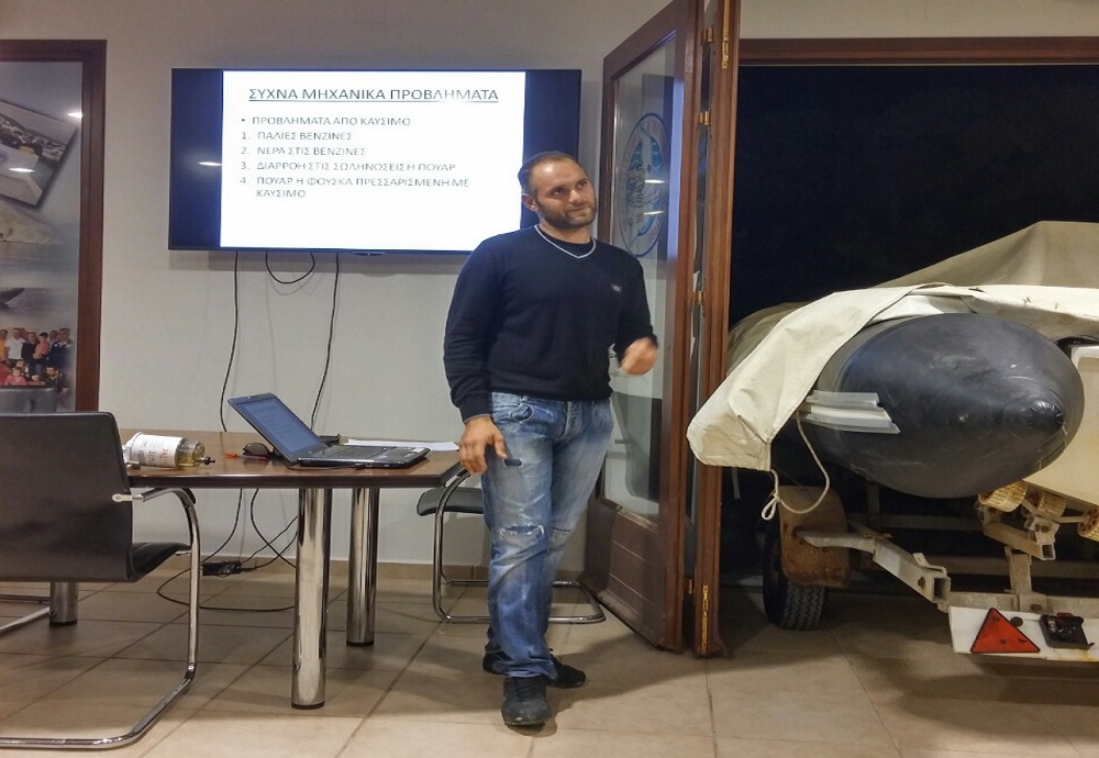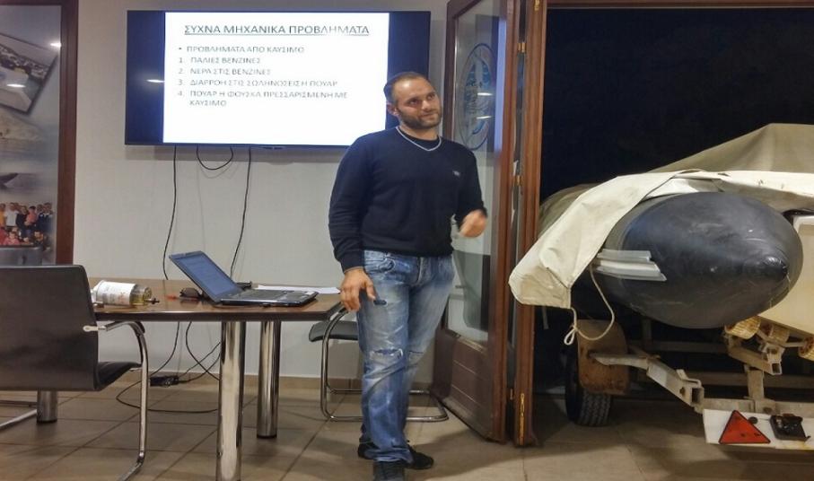 Πριν από μερικά εικοσιτετράωρα ο Όμιλος Φουσκωτών και Ταχυπλόων Σκαφών Σύρου πραγματοποίησε σεμινάριο με θέμα «Εξωλέμβιες Μηχανές Θαλάσσης». Εισηγητής ήταν ο μηχανικός εξωλέμβιων μηχανών θαλάσσης και μέλος του ομίλου, Θαλασσινός Παναγιώτης. Στο σεμινάριο παρουσιάστηκαν τα βασικά μέρη μίας μηχανής καθώς και οι γενικές πληροφορίες συντήρησής της. Οι συμμετέχοντες είχαν την ευκαιρία να βλέπουν όλα όσα λέει ο εισηγητής πάνω σε μία μηχανή που υπήρχε στο εντευκτήριο του ομίλου. Στη συνέχεια τονίστηκε τι πρέπει να κάνουν οι κυβερνήτες πριν και μετά από κάθε ταξίδι και δόθηκε γραπτή λίστα με τα απαραίτητα εργαλεία που πρέπει να έχουμε μέσα στο σκάφος. Πολύ σημαντικό κεφάλαιο ήταν τα συχνά μηχανικά προβλήματα που αντιμετωπίζουμε στα σκάφη καθώς και οι άμεσες λύσεις τους.