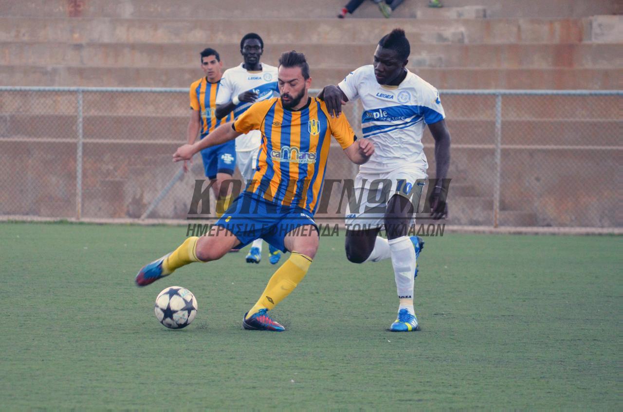 Οι Συριανοί πριν από μία εβδομάδα περίπου είχαν επικρατήσει δύσκολα με 2-1 της Άνω Μεράς, στο γήπεδο της ΕΠΣ Κυκλάδων – Ερμούπολης και το ίδιο θέλουν να επαναλάβουν, ώστε να βρεθούν πιο κοντά στον έναν από τους δύο στόχους που έχουν θέσει για τη φετινή χρονιά. Η εικόνα του πρώτου ματς σίγουρα ήταν διαφήμιση γι' αυτό που θα ακολουθούσε, αφού ήταν ένα παιχνίδι που έκοβε την ανάσα και ήταν ανοικτό σε κάθε αποτέλεσμα. Να θυμίσουμε ότι η Συριανή ομάδα είχε προηγηθεί στο σκορ με το φάουλ του Πρίντεζη, νωρίτερα είχε δοκάρι με τον Σταματίου, όμως με την συμπλήρωση μισής ώρας αγώνα, οι φιλοξενούμενοι κέρδισαν πέναλτι και ο ΕΛ Κάντι, όπου θα απουσιάσει από το αυριανό ματς δέχθηκε την κόκκινη κάρτα του Ζαράνη. Για μία ώρα περίπου η ομάδα του Μάκη Πούλου έπαιζε με παίκτη λιγότερο, αλλά αυτό το πλεονέκτημα δεν τον εκμεταλλεύτηκαν οι Μυκονιάτες. Έτσι, φτάσαμε στο 88' όπου ο Σταματίου με σουτ από το ύψος της μεγάλης περιοχής λύτρωσε τους Συριανούς και τους έδωσε το “χρυσό” τρίποντο, όπου τους έφερε μόνους πρώτους στον Α' όμιλο.