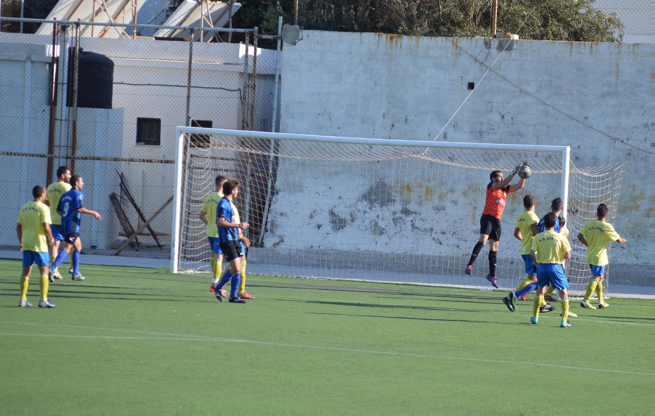 Πολλά λάθη και γραμμές χωρίς καμία συνοχή, ήταν η εικόνα του Α.Ο. Σύρου, αφού σε καμία περίπτωση σε απείλησε τον Α.Ο. Μυκόνου, που βρέθηκε στη Σύρο με αρκετές απουσίες σύμφωνα με τον Θεόφιλο Παχατουρίδη. Μία καλή ευκαιρία στο πρώτο ημίχρονο με το σουτ του Μπαλόπιτα από τα αριστερά της μεγάλης περιοχής ήταν ότι καλύτερο για τους Συριανούς. Βέβαια ούτε και η Μύκονος έχασε πολλές ευκαιρίες, όμως ήταν η ομάδα που εκμεταλλεύτηκε το κενό στην άμυνα και με πλασέ ο Μύρτινας στο 35', σημείωσε το μοναδικό τέρμα της αναμέτρησης.