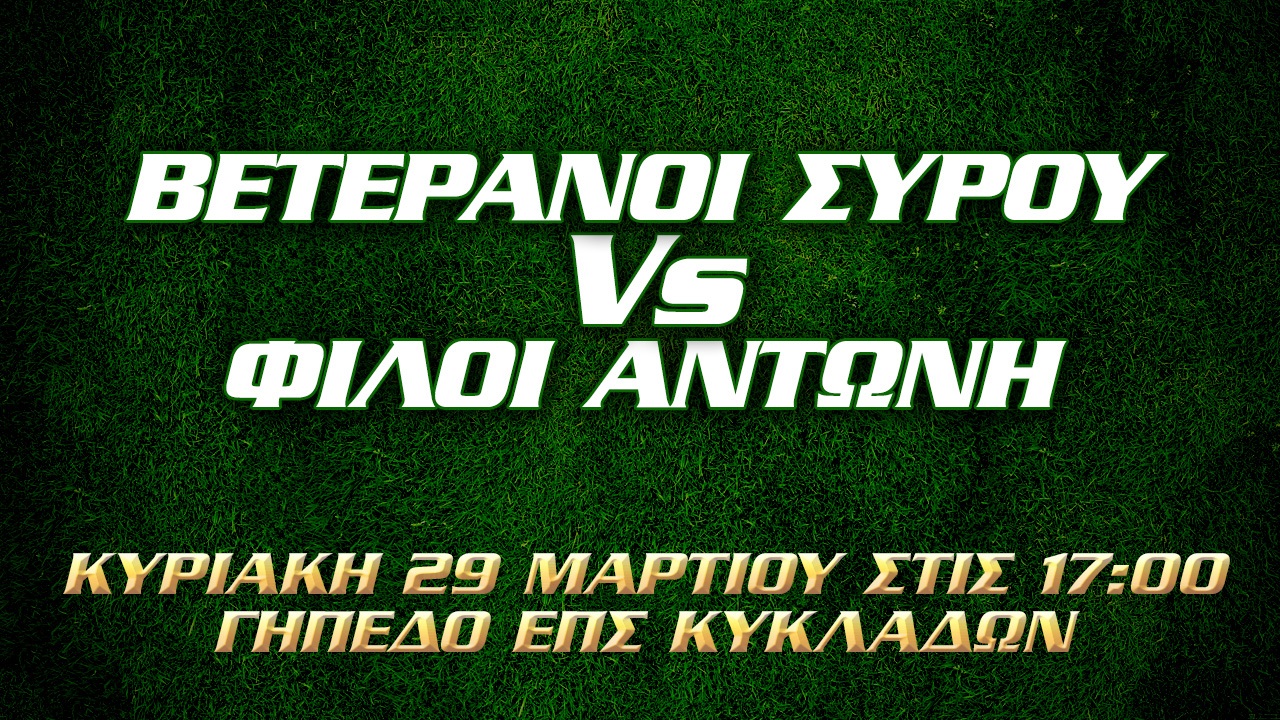 Την Κυριακή στις 17:00, στο γήπεδο της Ερμούπολης, θα πραγματοποιηθεί ακόμη ένα παιχνίδι κοινωνικού χαρακτήρα. Αυτή τη φορά οι Βετεράνοι Σύρου θα βρεθούν αντιμέτωποι με τους φίλους του Αντώνη. Όπως είναι γνωστό πριν από λίγους μήνες ο φίλος Αντώνης έφυγε από κοντά μας. Φίλοι, γνωστοί αλλά και όσοι τον γνώριζαν θα βρεθούν στο γήπεδο της Ερμούπολης για να τιμήσουν την μνήμη του και μέσα από εκεί αν μπορούν να βοηθήσουν την οικογένειά του και τα δύο μικρά παιδιά του.