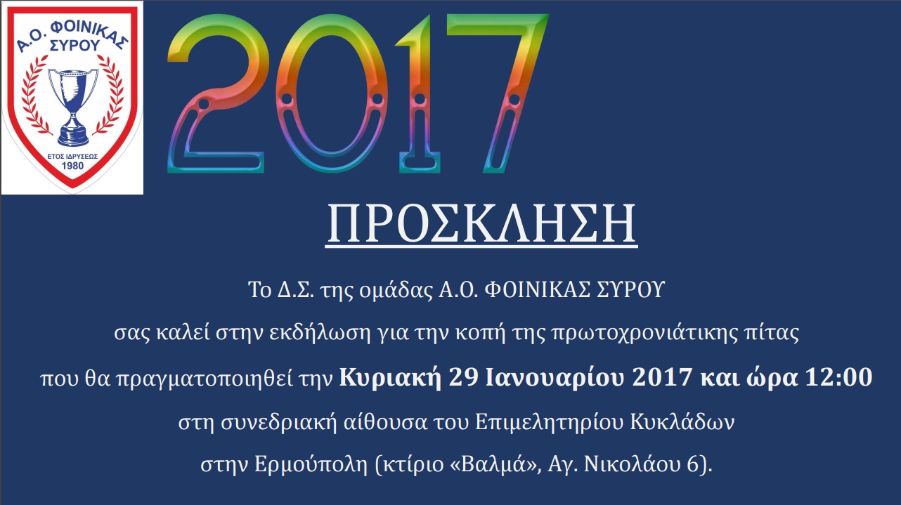 "Το Δ.Σ. της ομάδας Α.Ο. ΦΟΙΝΙΚΑΣ ΣΥΡΟΥ σας καλεί στην εκδήλωση για την κοπή της πρωτοχρονιάτικης πίτας που θα πραγματοποιηθεί τηνΚυριακή 29 Ιανουαρίου 2017και ώρα 12:00στη συνεδριακή αίθουσα του Επιμελητηρίου Κυκλάδων στην Ερμούπολη (κτίριο «Βαλμά», Αγ. Νικολάου 6)".