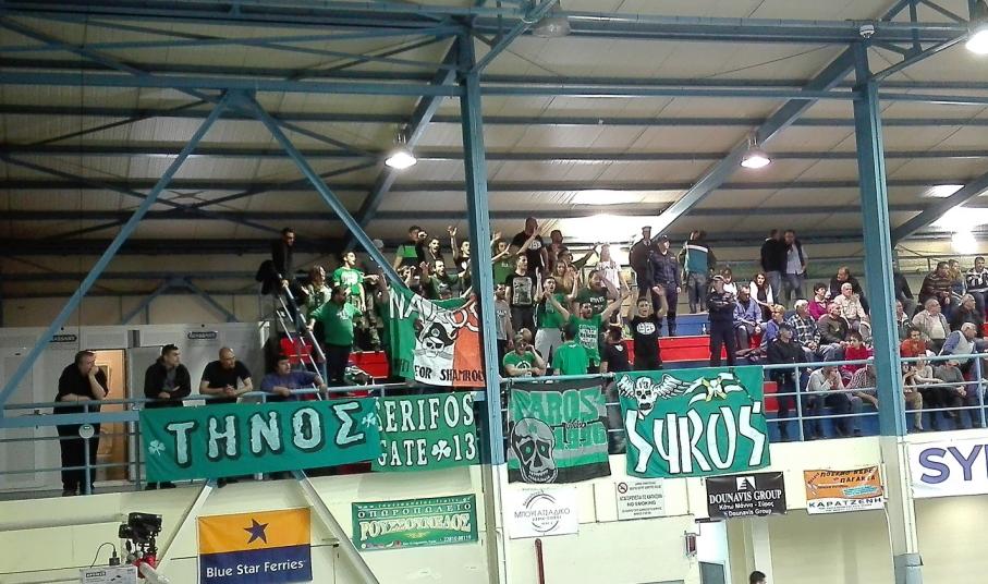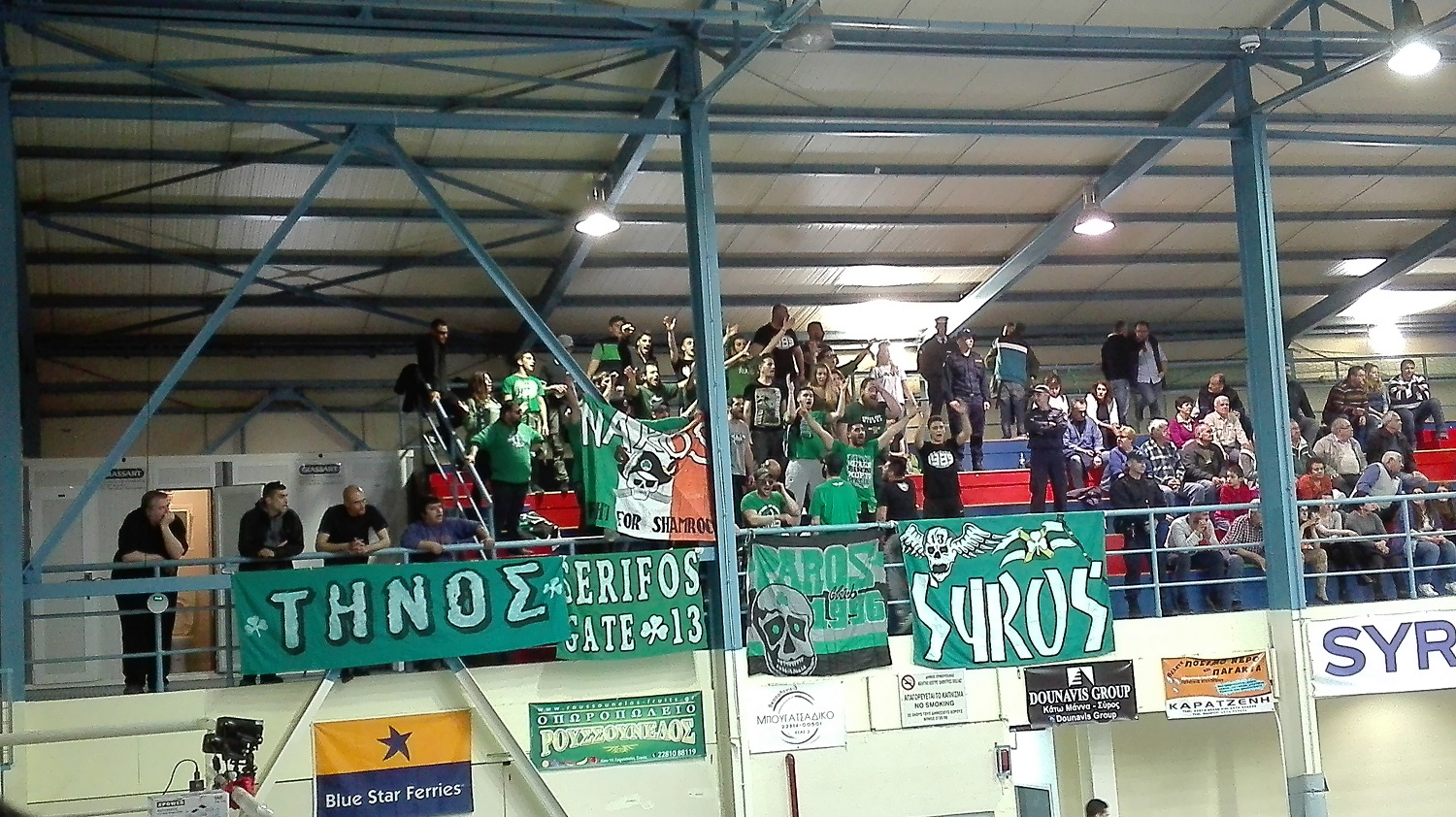 Για ακόμη μία φορά οι φίλοι του Παναθηναϊκού κυρίως από τα νησιά των Κυκλάδων έδωσαν βροντερό παρών και τραγουδούσαν καθ’ όλη τη διάρκεια της αναμέτρησης. Δεν δημιούργησαν κανένα πρόβλημα αν και ήταν κοντά στους φίλους της Σύρου, και έδωσαν ένα ιδιαίτερο τόνο στην αναμέτρηση. Στις εξέδρες της Β’ κλειστής αίθουσας του αθλητικού κέντρου του Δήμου Σύρου – Ερμούπολης υπήρξαν φίλοι του Παναθηναϊκού, τόσο από την Σύρο όσο κι από την Τήνο, την Πάρο και τη Νάξο. Οι πράσινοι φίλαθλοι βρέθηκαν στην πρωτεύουσα των Κυκλάδων για να ενισχύσουν τις προσπάθειες των αθλητών του κ. Ανδρεόπουλου.