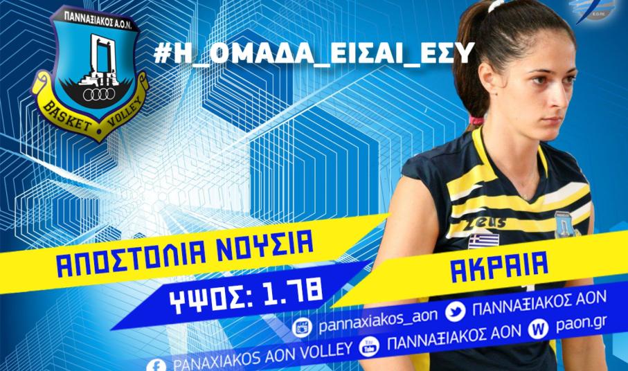 «Ο πρόεδρος και το Δ.Σ. του Πανναξιακού Α.Ο.Ν. καλωσορίζουν στις τάξεις του συλλόγου, την Αποστολία Νούσια. Η 26χρονη ακραία από τη Λάρισα, επιστρέφει στο σύλλογο του Πανναξιακού μετά από ένα χρόνο και θα αγωνιστεί στην ομάδα μας την αγωνιστική περίοδο 2017-2018. Η Αποστολία Νούσια με την αγωνιστική της παρουσία θα συμβάλει στην προσπάθεια της γυναικείας ομάδας βόλεϊ του Πανναξιακού ΑΟΝ για την επίτευξη των στόχων του Πανναξιακού, στις εγχώριες διοργανώσεις».