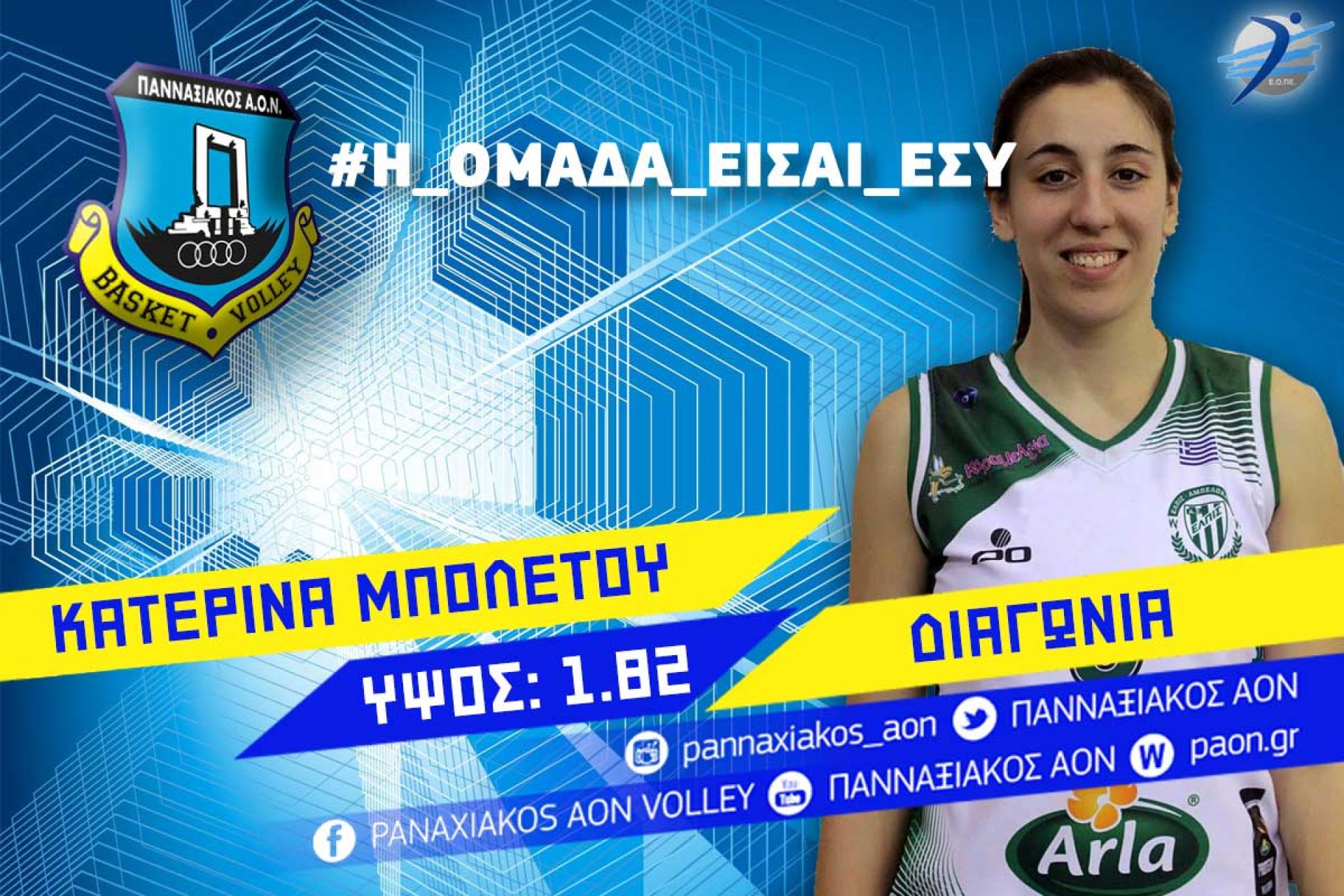 Ο πρόεδρος και το Δ.Σ. του Πανναξιακού Α.Ο.Ν. έχουν τη χαρά να υποδεχτούν στο σύλλογό μας και τη Νάξο την διαγώνιο Κατερίνα Μπολέτου, η οποία θα ανήκει στο δυναμικό της ομάδας μας, για την αγωνιστική περίοδο 2017-2018.