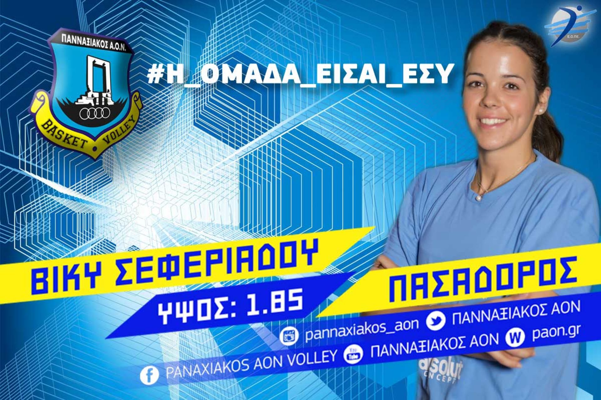 «Ο πρόεδρος και το Δ.Σ. του Πανναξιακού Α.Ο.Ν. έχουν τη χαρά να ανακοινώσουν την ανανέωση της συνεργασίας της ομάδα μας με την πασαδόρο Βασιλική Σεφεριάδου, η οποία θα ανήκει στο δυναμικό της ομάδας βόλεϊ γυναικών του συλλόγου μας, για την αγωνιστική περίοδο 2017-2018.