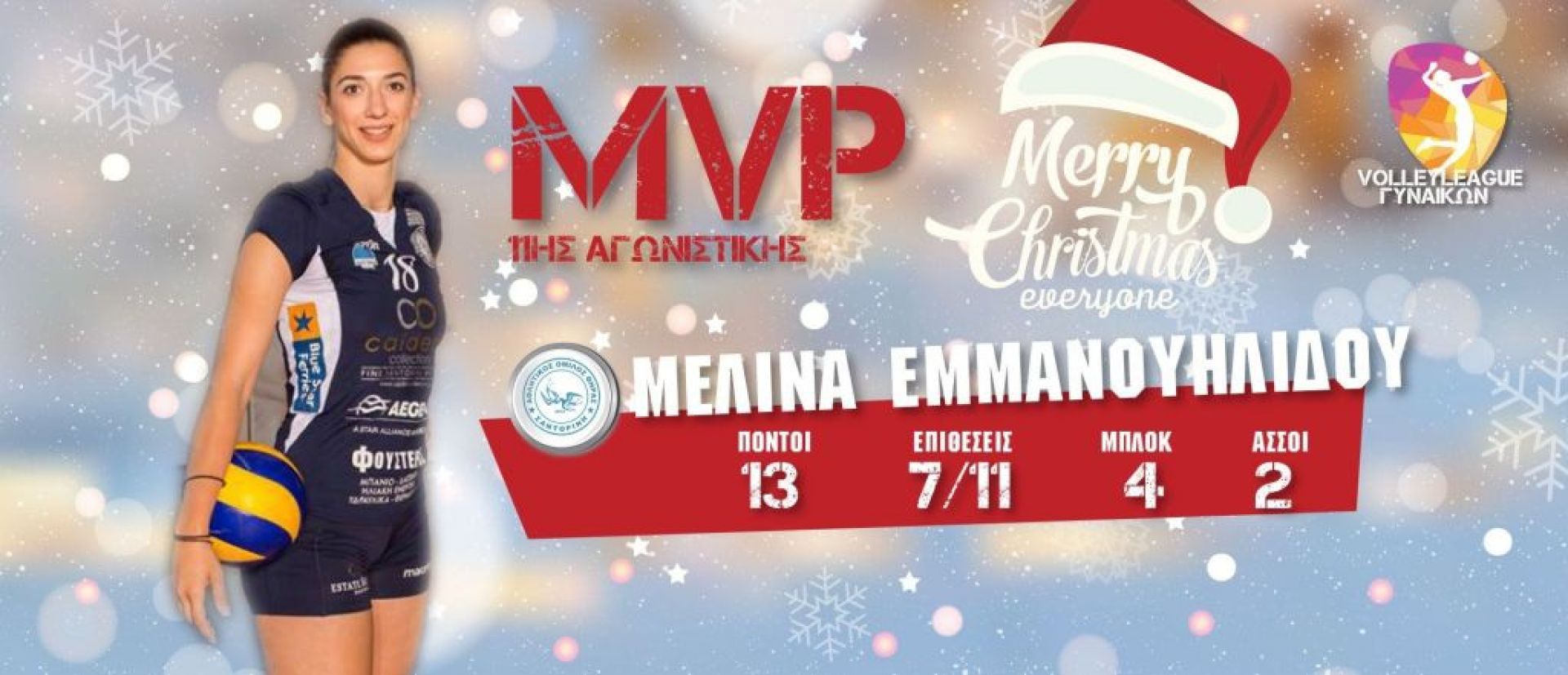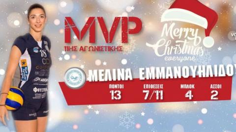 Η Μελίνα Εμμανουηλίδου του ΑΟ Θήρας σύμφωνα με τα στατιστικά, αλλά και την εν γένει παρουσία στο παιχνίδι της ομάδας της, της έδωσαν τον τίτλο της καλύτερης αθκλήτριας για την 11 αγωνιστική του πρωταθλήματος της Volleyleague Γυναικών.