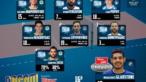 ΟΛΥΜΠΙΑΚΟΣ (Μπενίτεθ Μουνιόθ): Πετρέας 6π. (3/5επ., 2 μπλοκ, 1 άσσος), Μπέμε 8 (4/8, 3 μπλοκ, 1 άσσος), Σμιτ 12 (12/23επ.), Τερβαπόρτι 2 (1/1, 1 άσσος), Αλεξίεφ 2 (2/10, 29%υπ., 29%αρ.), Ραουβέρντινκ 5 (4/11επ., 1 άσσος, 42%υπ., 37%αρ.) / Στεφάνου (λ. - 50%υπ., 28%αρ.), Κουμεντάκης 4 (3/5, 1 μπλοκ, 20%υπ., 20%αρ.), Στιβαχτής, Χριστοφιδέλης, Ζουπάνι 1 (1/1επ.).