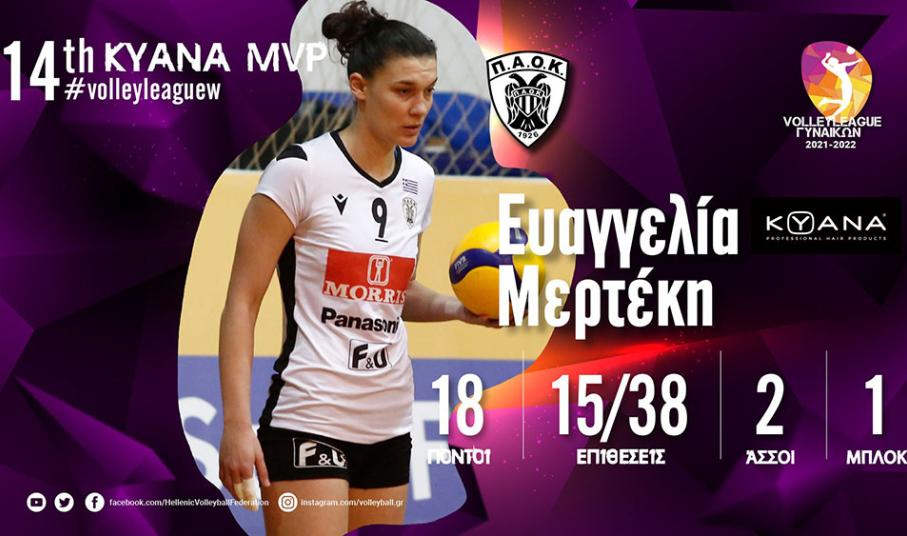 Η Ευαγγελία Μερτέκη του Π.Α.Ο.Κ. αναδείχθηκε KYANA MVP της 14ης αγωνιστικής της Volley League Γυναικών. Η διεθνής ακραία του Δικεφάλου στο ντέρμπι κόντρα στον Α.Ο. Θήρας στη Σαντορίνη ήταν η πρώτη σκόρερ με 18 πόντους (15/38 επ., 2 άσσους, 1 μπλοκ), έχοντας μόλις δύο λάθη στην υποδοχή σε 22 προσπάθειες.