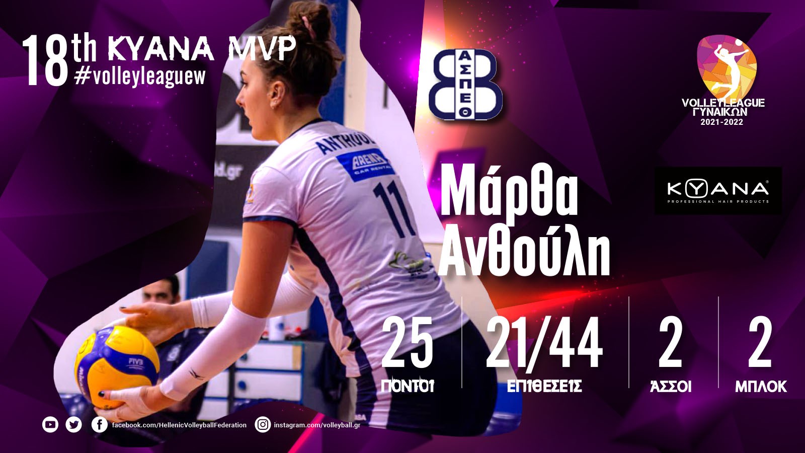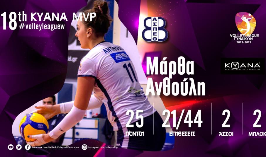 Η διεθνής διαγώνια της Θέτιδας, Βούλας Μάρθα Ανθούλη, είναι η KYANA MVP της 18ης αγωνιστικής της Volley League Γυναικών. Η 17χρονη αθλήτρια, μέλος της Εθνικής γυναικών οδήγησε την ομάδα της στη νίκη με 3-1 σετ στην έδρα της ΑΕΚ, στην δεύτερη φετινή επικράτηση της Θέτιδας Βούλας επί της Ένωσης.