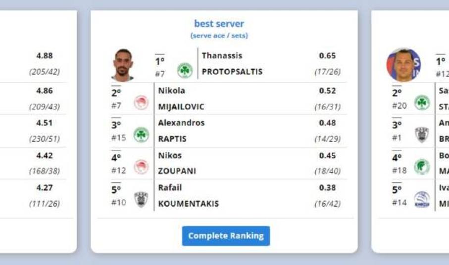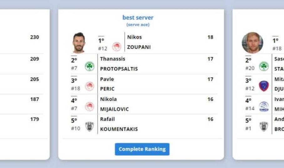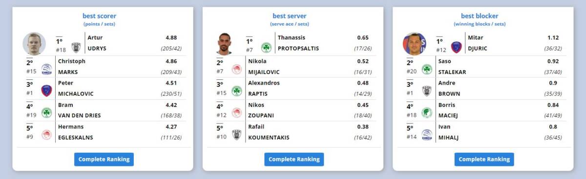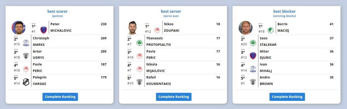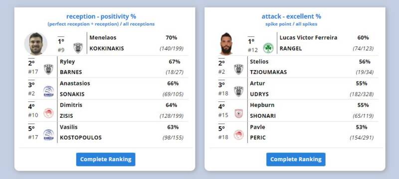 Στο τελείωμα της Α΄ φάσης, τα στατιστικά στοιχεία που παρουσίασε η ΕΣΑΠ, φέρνουν τους Δημήτρη Τζούριτς και Πίτερ Μιχάλοβιτς, πρώτους στις κατηγορίες τους, “καλύτερος μπλοκέρ” με πόντους ανά σετ και “πρώτος σκόρερ” αντίστοιχα.