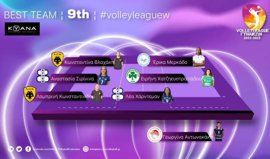 Στην καλύτερη επτάδα της 9ης αγωνιστικής συμπεριλήφθηκε η Έρικα Μερκάδο του Α.Ο. θήρας. Η διαγώνιος της ομάδας της Σαντορίνης σημείωσε συνολικά 19 πόντους έχοντας ταυτόχρονα εξαιρετικά στατιστικά. Να θυμίσουμε πως ο Α.Ο. Θήρας επικράτησε με 3-0 του Άρη και η Μερκάδο είχε 19 πόντους με τα εξής στατιστικά (15/28 επ., 1 άσσος, 3 μπλοκ). Το συγκρότημα του Βάντιμιρ Βάσοβιτς βρίσκεται πλέον μία ανάσα από την τετράδα, καθώς η ανοδική του πορεία συνεχίζεται με εντυπωσιακό τρόπο.