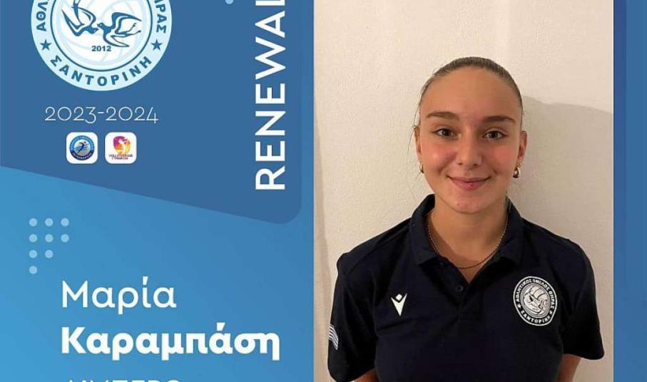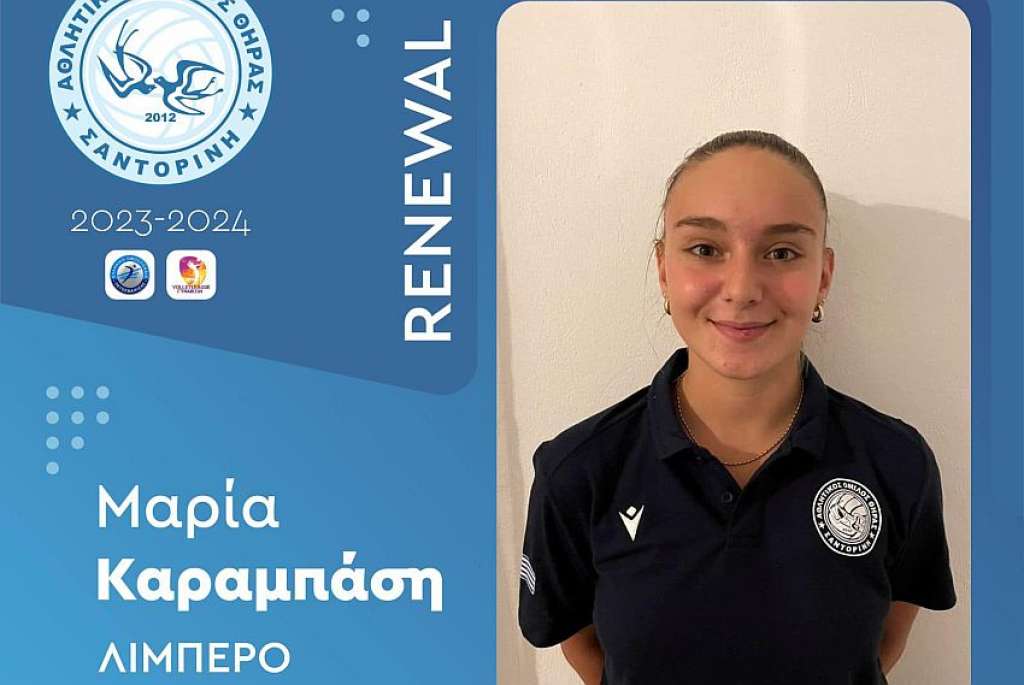 «Η διοίκηση του Α.Ο. Θήρας είναι στην ευχάριστη θέση να ανακοινώσει την ανανέωση της συνεργασίας του με την αθλήτρια Μαρία Καραμπάση ενόψει της νέας αγωνιστικής σεζόν της Volleyleague γυναικών 2023-2024.